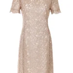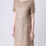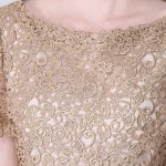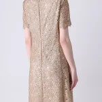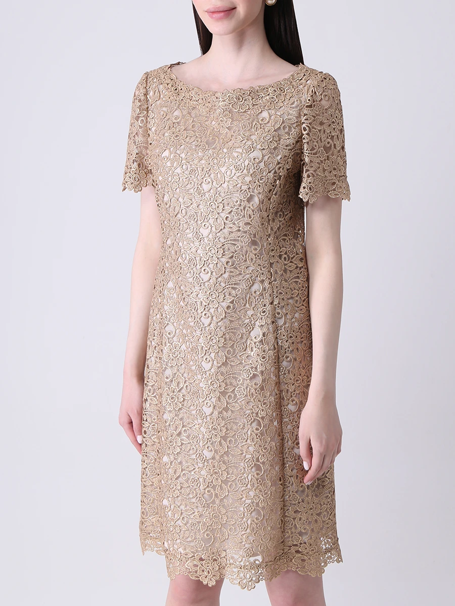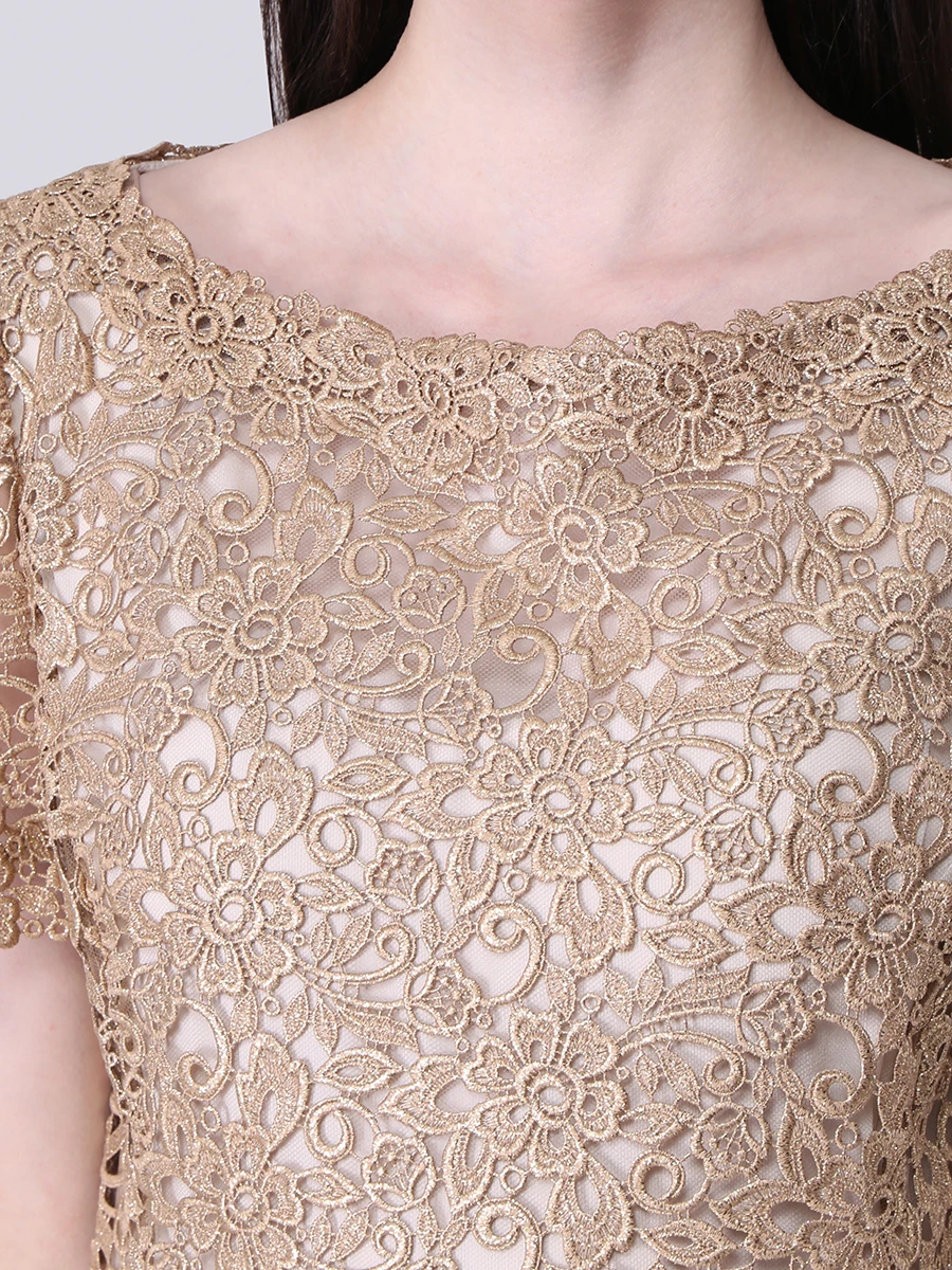 -Золотистое платье с шитьем-кружевом от BLUMARINE. -Крой по фигуре, короткие рукава, круглый вырез горловины, молния на спинке, изящная витая вышивка по тонкой сетке в основе шитья. -Данный товар отправляется только по полной предоплате.