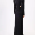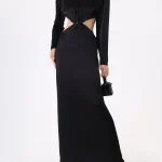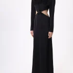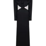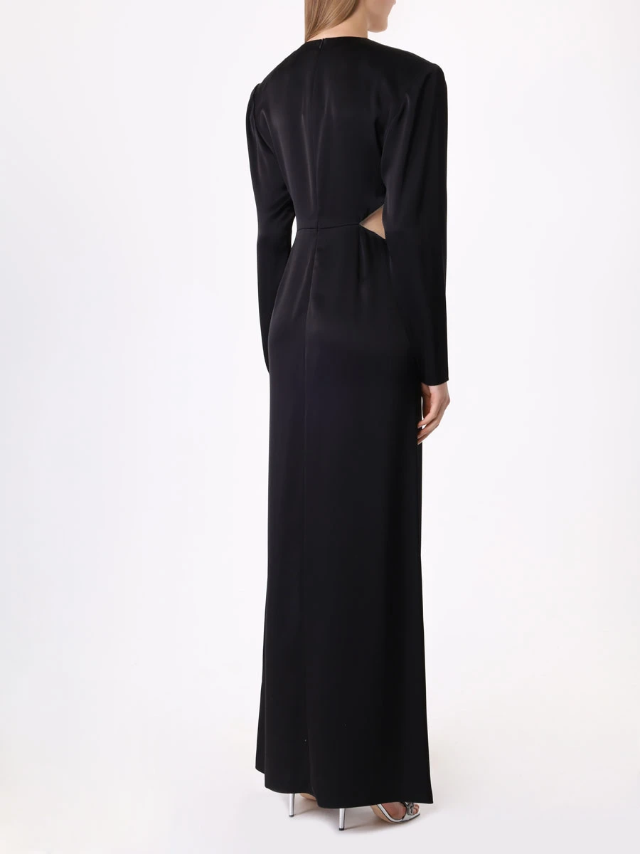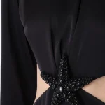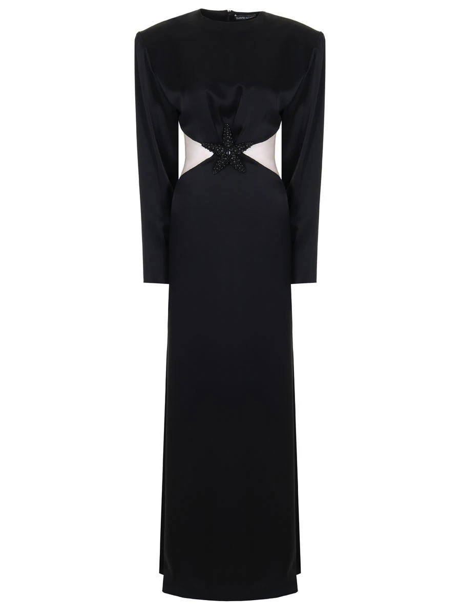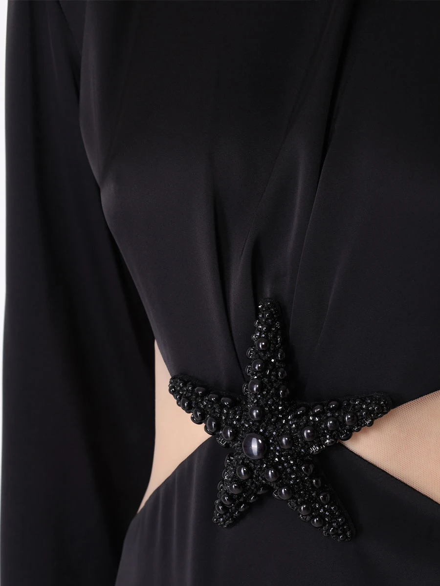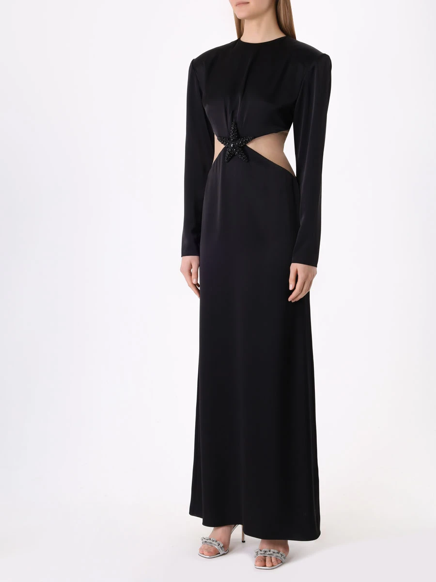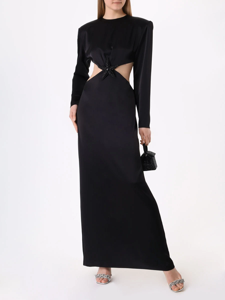 -Черное вечернее платье-макси из сатина с деликатным блеском от DAVID KOMA. -Модель облегающего кроя с клиновидными вставками из нюдовой сетки на талии, которые приближают фигуру к эталонным песочным часам. -Роль особого акцента отведена декоративной звезде на талии с полусферами и стразами в тон основному. -Детали: длинные рукава, круглый вырез горловины, застежка на потайную молнию сзади.