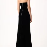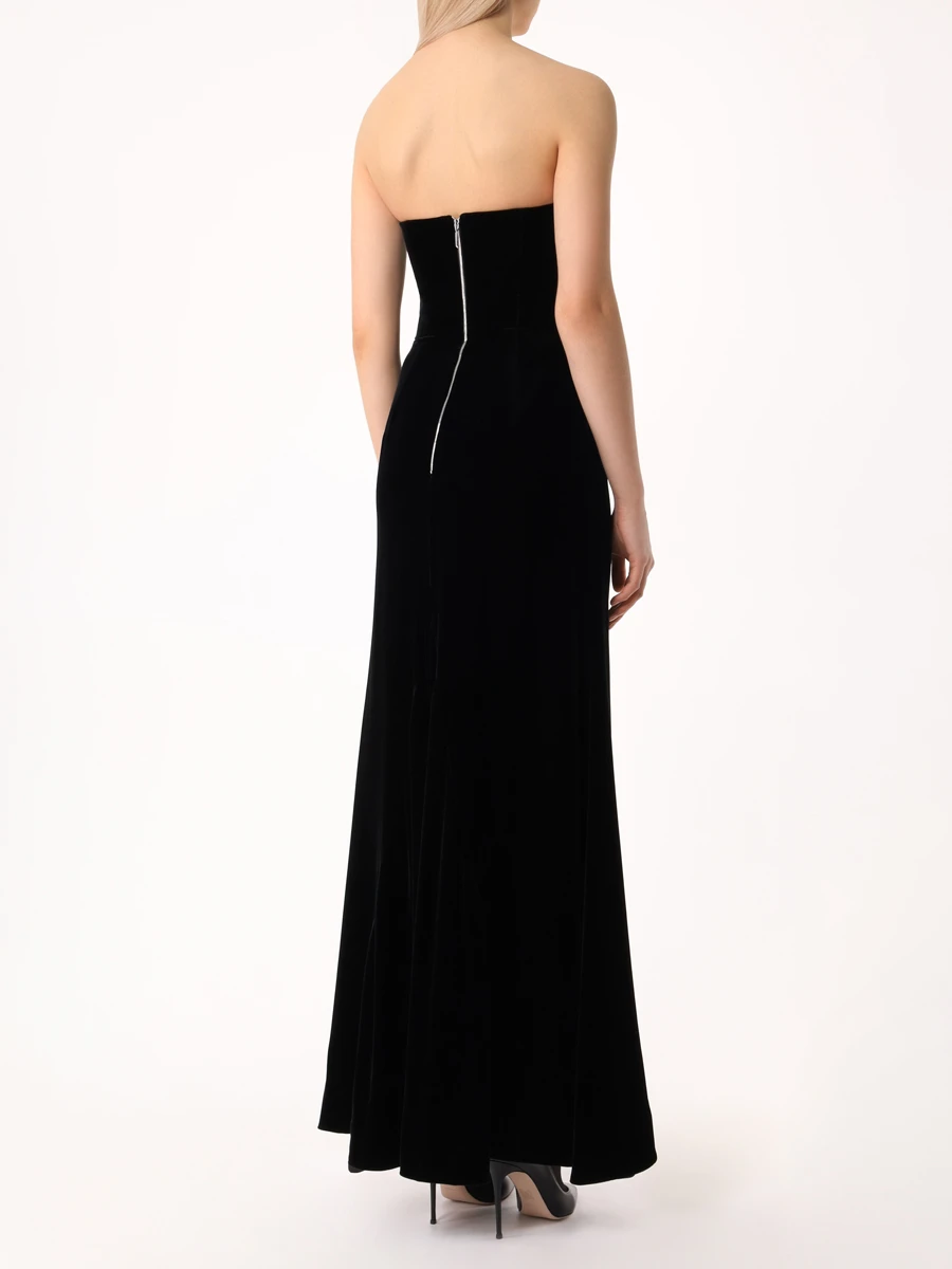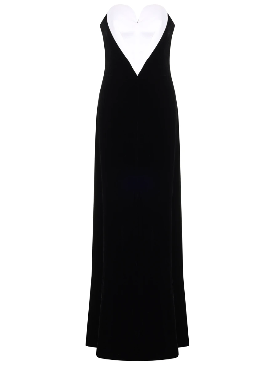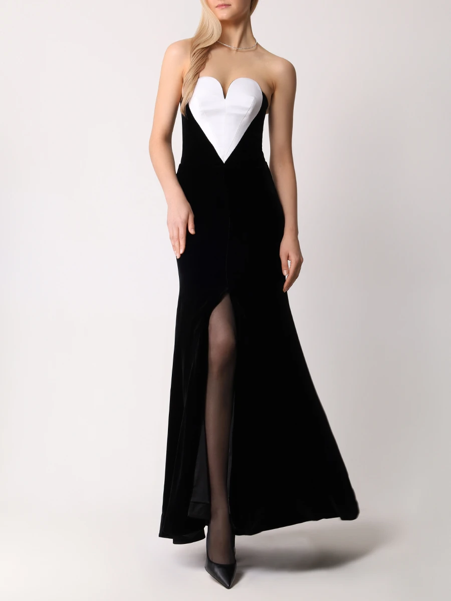-Черное платье из бархата на основе смесового шелка от MUZE. -Модель приталенного кроя, деликатно облегающего талию и бедра, с расклешенной юбкой, открытыми плечами и спиной, контрастной вставкой в форме сердца на груди, застежкой на молнию на спине, глубоким разрезом спереди. -Вечерний образ дополнят базовые туфли-лодочки или босоножки на высоком каблуке. ВАЖНО! Изделие имеет индивидуальный крой и большемерит на размер, подберите размер по Вашим объемам или обратитесь к нам, и мы поможем сделать выбор (замеры в см, ОГ — обхват груди, ОТ — обхват талии, ОБ — обхват бедер): XS 42RU: ОГ 84-86, ОТ 64, ОБ 92, длина 76; S 44RU: ОГ 88-90, ОТ 68, ОБ 96, длина 76; M 46RU: ОГ 92-94, ОТ 72, ОБ 100, длина 76; L 48RU: ОГ 96-98, ОТ 76, ОБ 104, длина 76.
