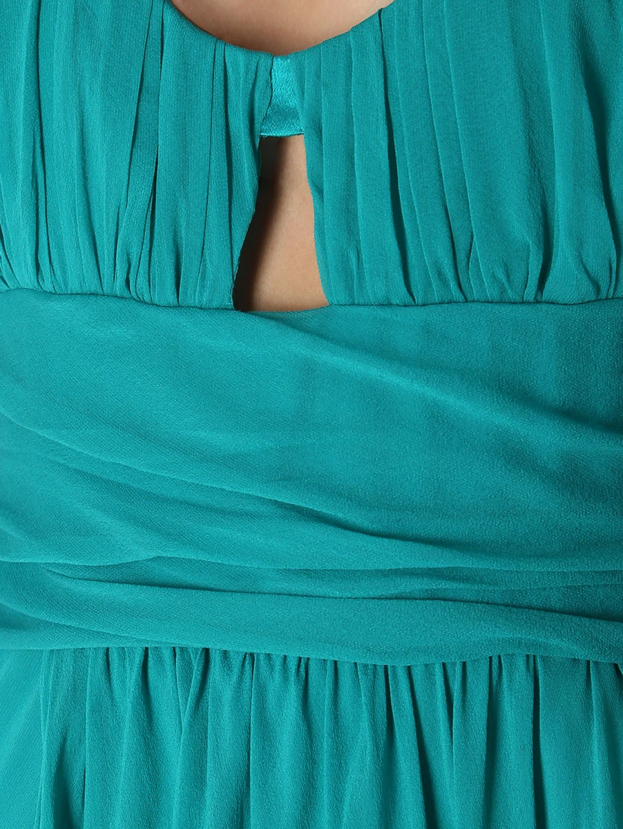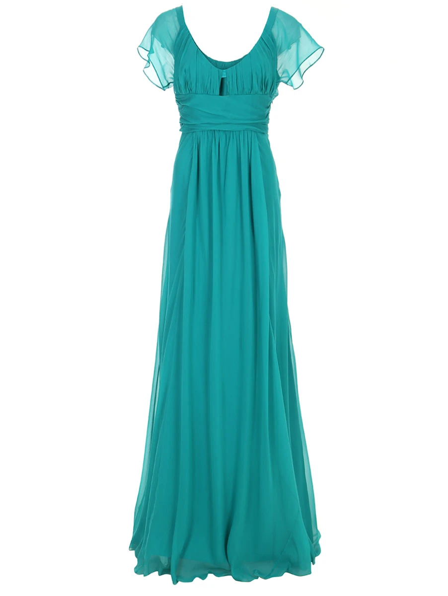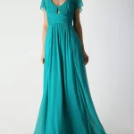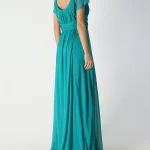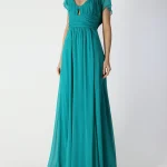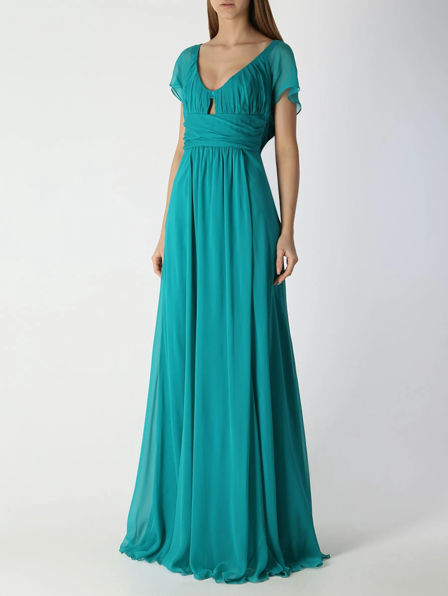 -Платье-макси из струящегося шелка с драпировкой от ALBERTA FERRETTI. -Приталенный крой, расклешенная юбка, V-образный вырез декольте, короткие рукава с оборкой.