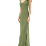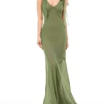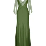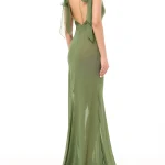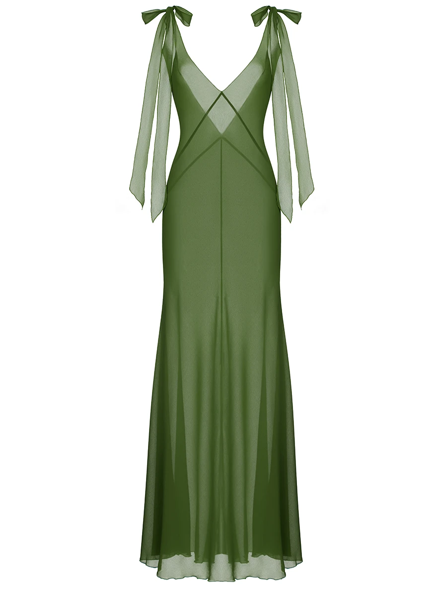 -Зеленое платье-комбинация из легкого шелкового шифона от ANY CASHONLYFUN. -Модель приталенного кроя с широкими бретелями на завязках, V-образным декольте и глубоким вырезом на спине. -Платье станет идеальным выбором для особых событий и незабываемых вечеров.