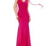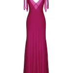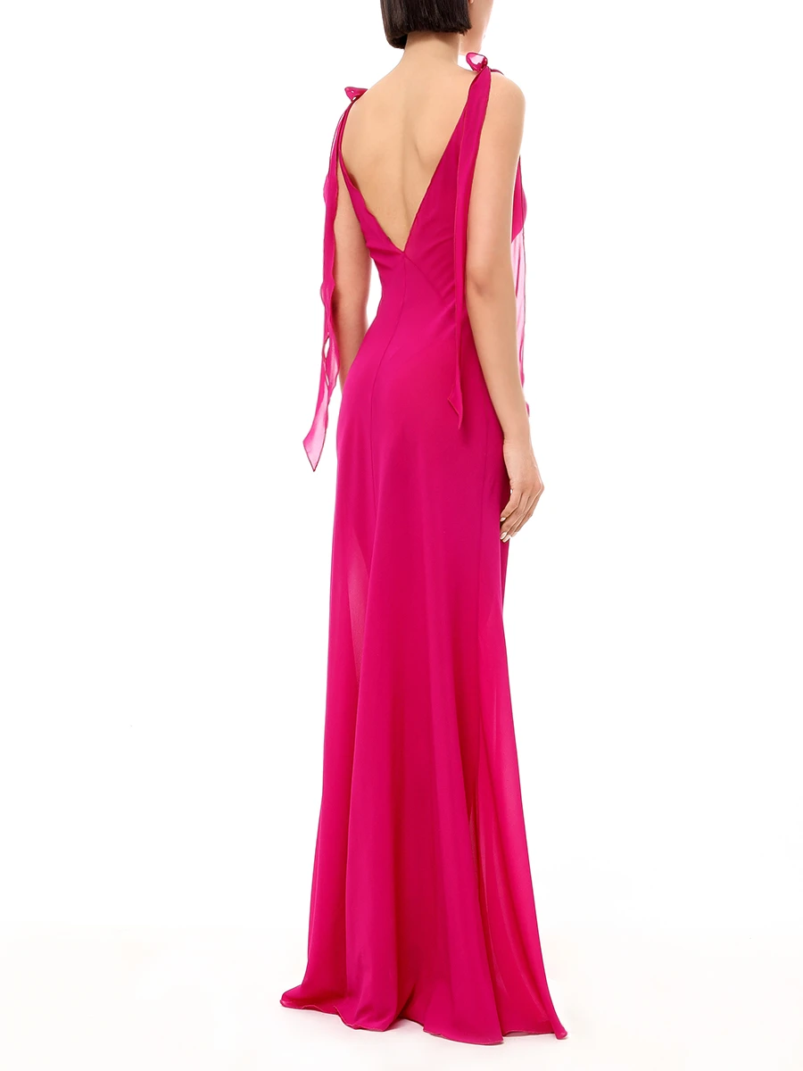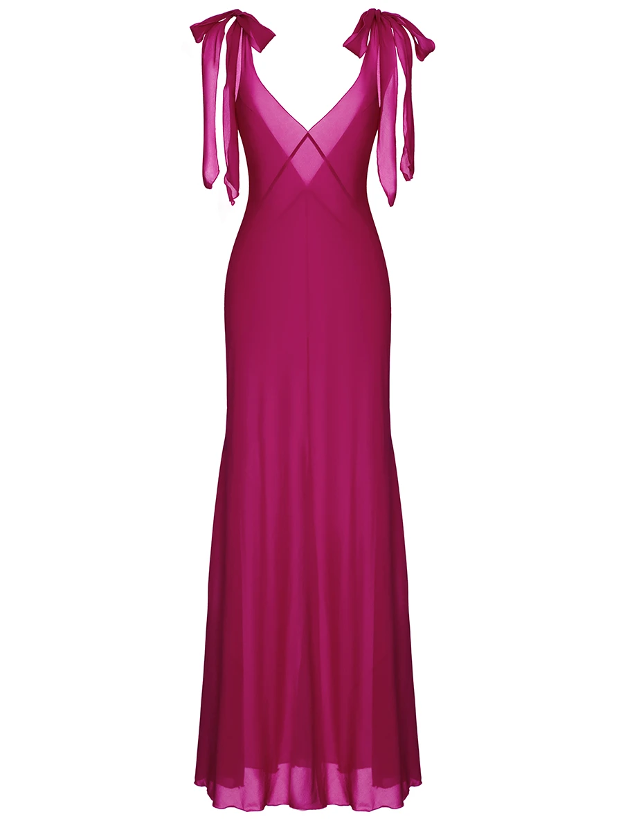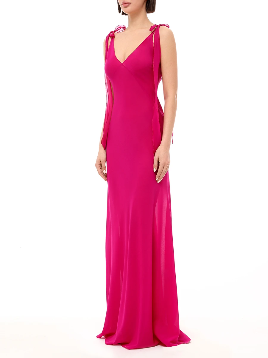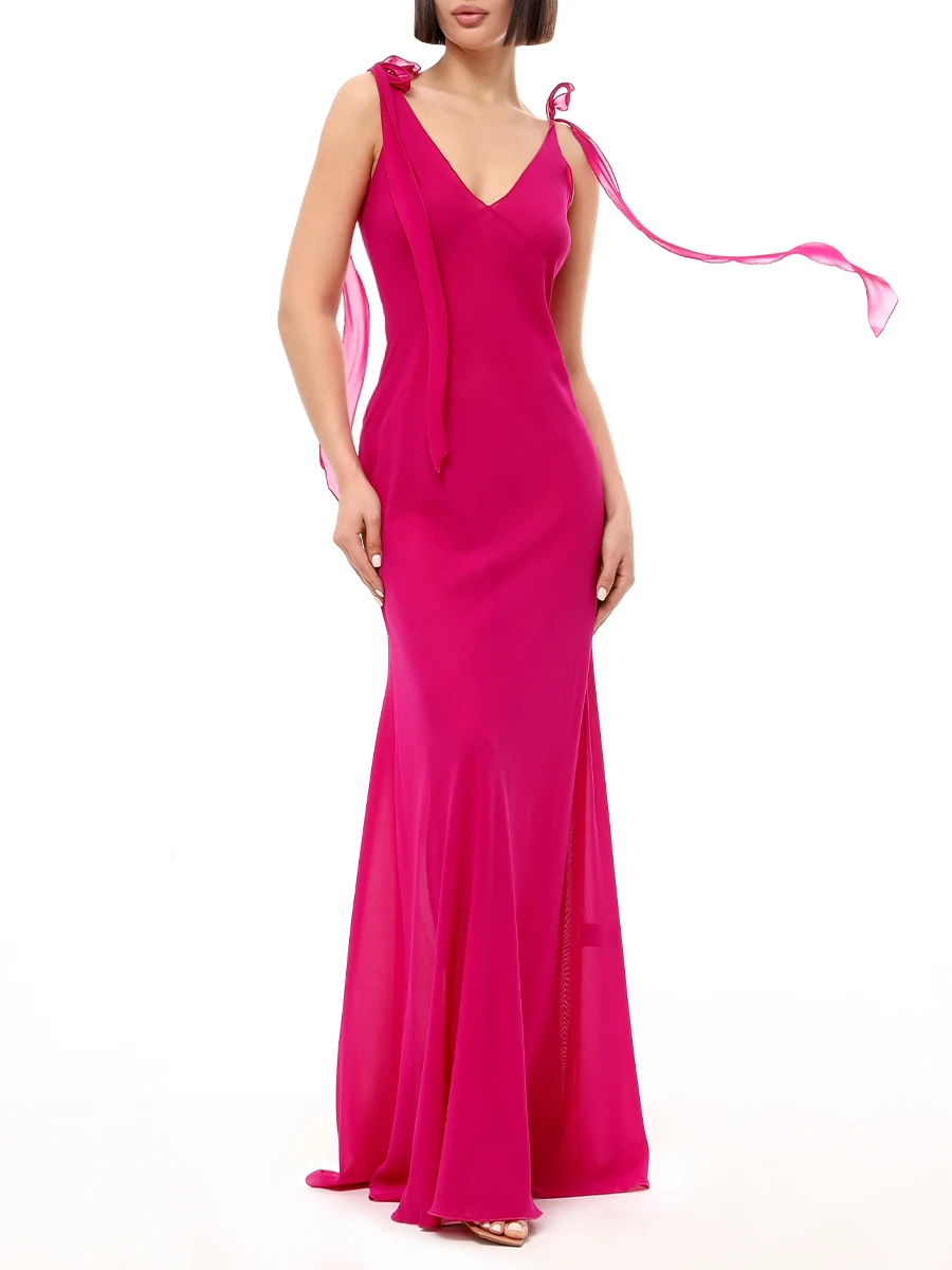 -Розовое платье-комбинация из легкого шелкового шифона от ANY CASHONLYFUN. -Модель приталенного кроя с широкими бретелями на завязках, V-образным декольте и глубоким вырезом на спине. -Платье станет идеальным выбором для особых событий и незабываемых вечеров.