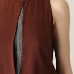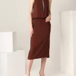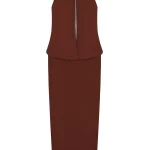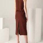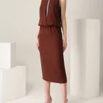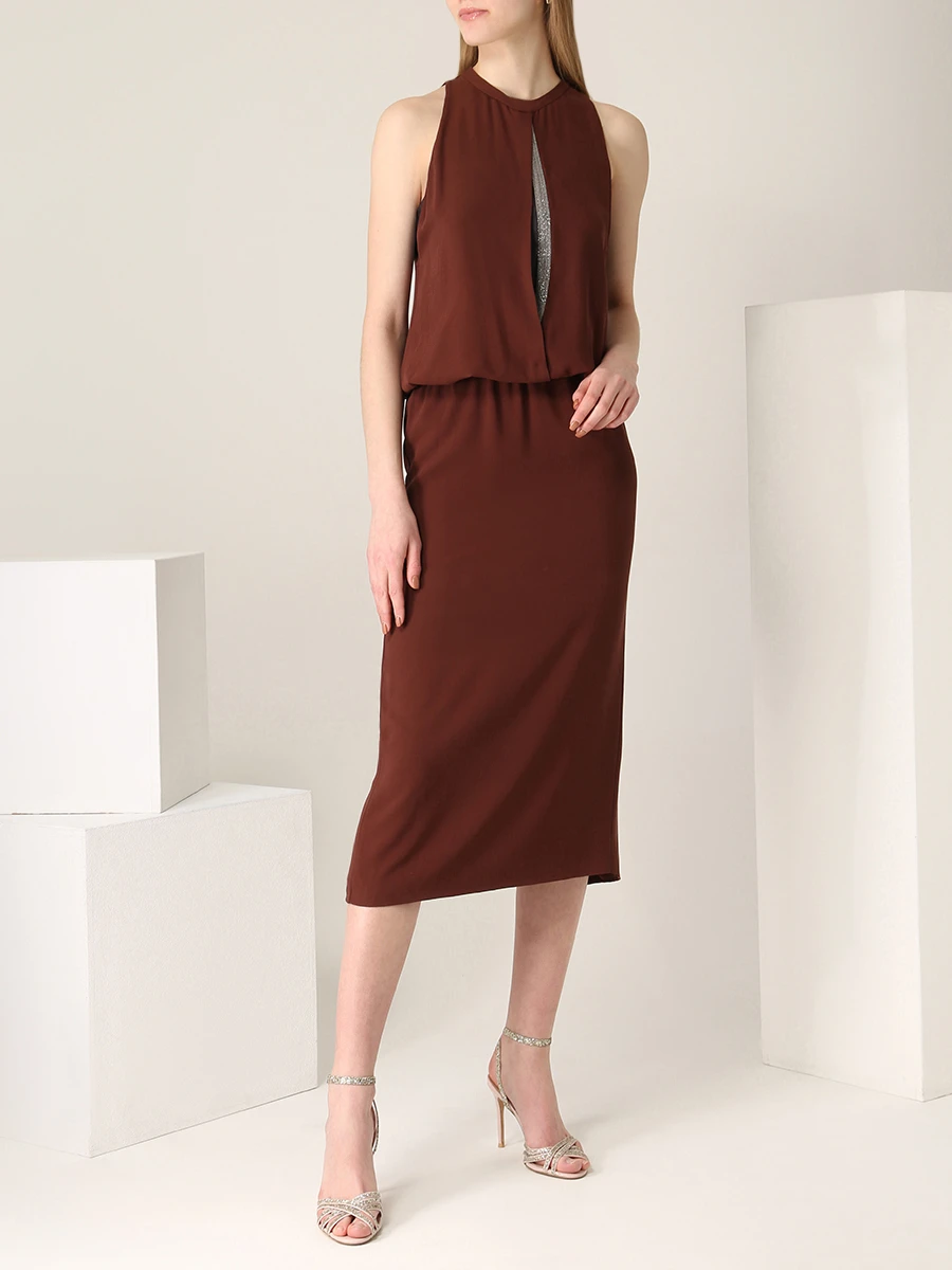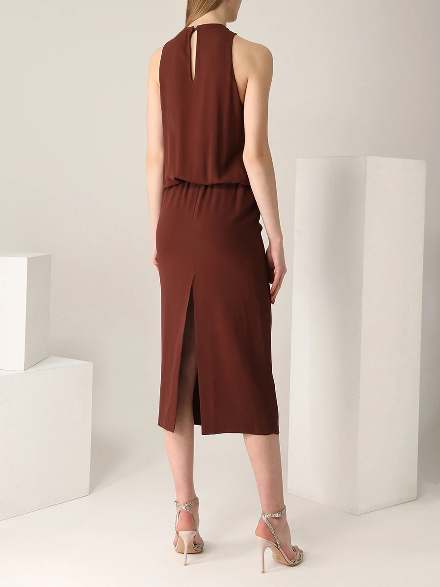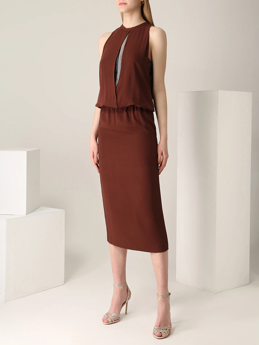 -Платье из струящегося шелка от BRUNELLO CUCINELLI. -Приталенный крой с легким напуском, юбка сдержанной длины миди, круглая горловина, вырез на груди с декором цепочками Мониль, шлица сзади.