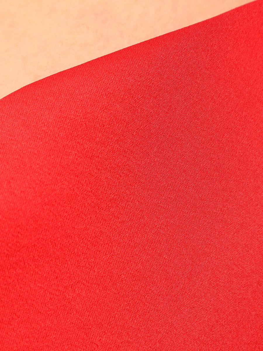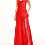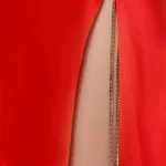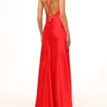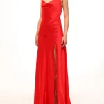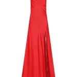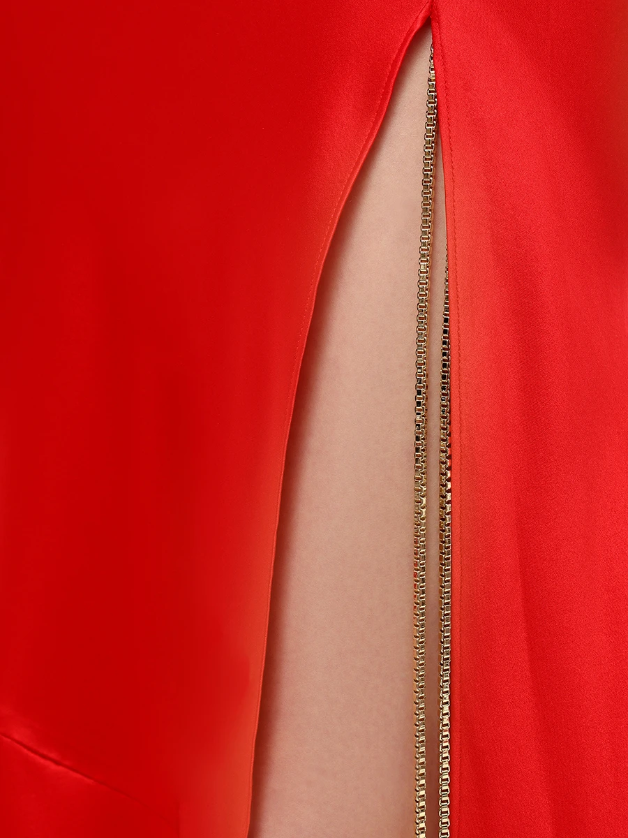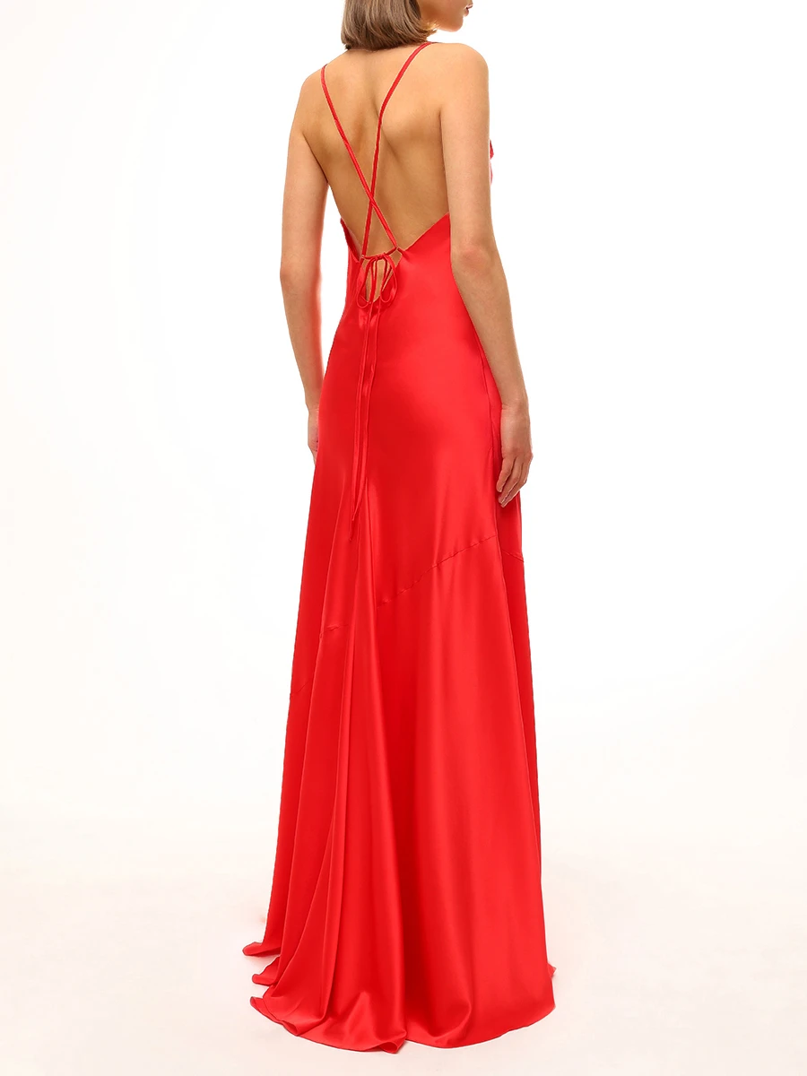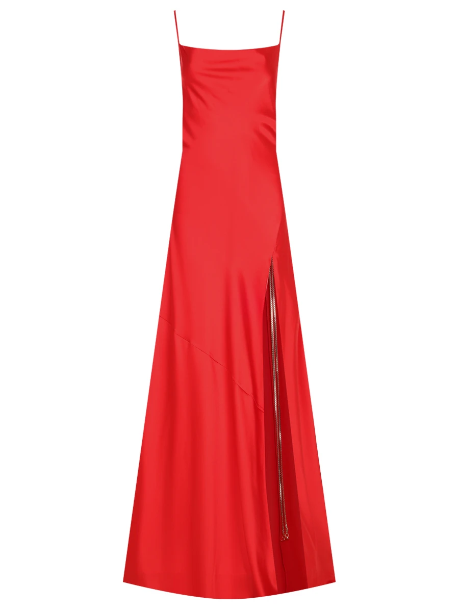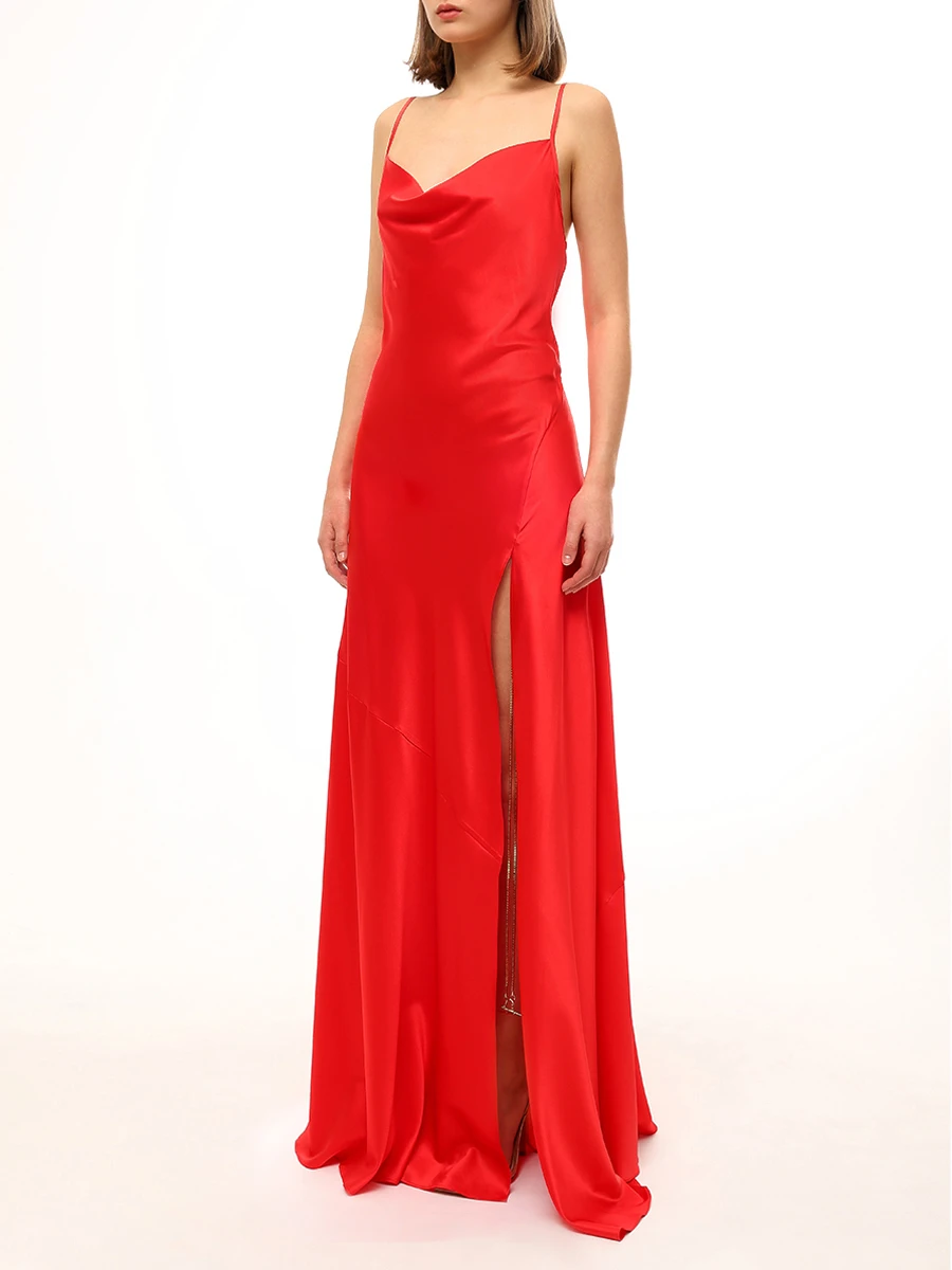 -Алое платье-макси из атласного шелка от DANAME. -Модель с акцентом кроя на талии, юбкой А-силуэта в пол, узкими бретелями на плечах, которые перекрещиваются на спине, драпировкой-качели в зоне декольте. -Вау-эффект создаёт высокий разрез с длинными серебристыми цепочками, которые органично сочетаются с насыщенным цветом.