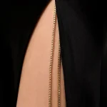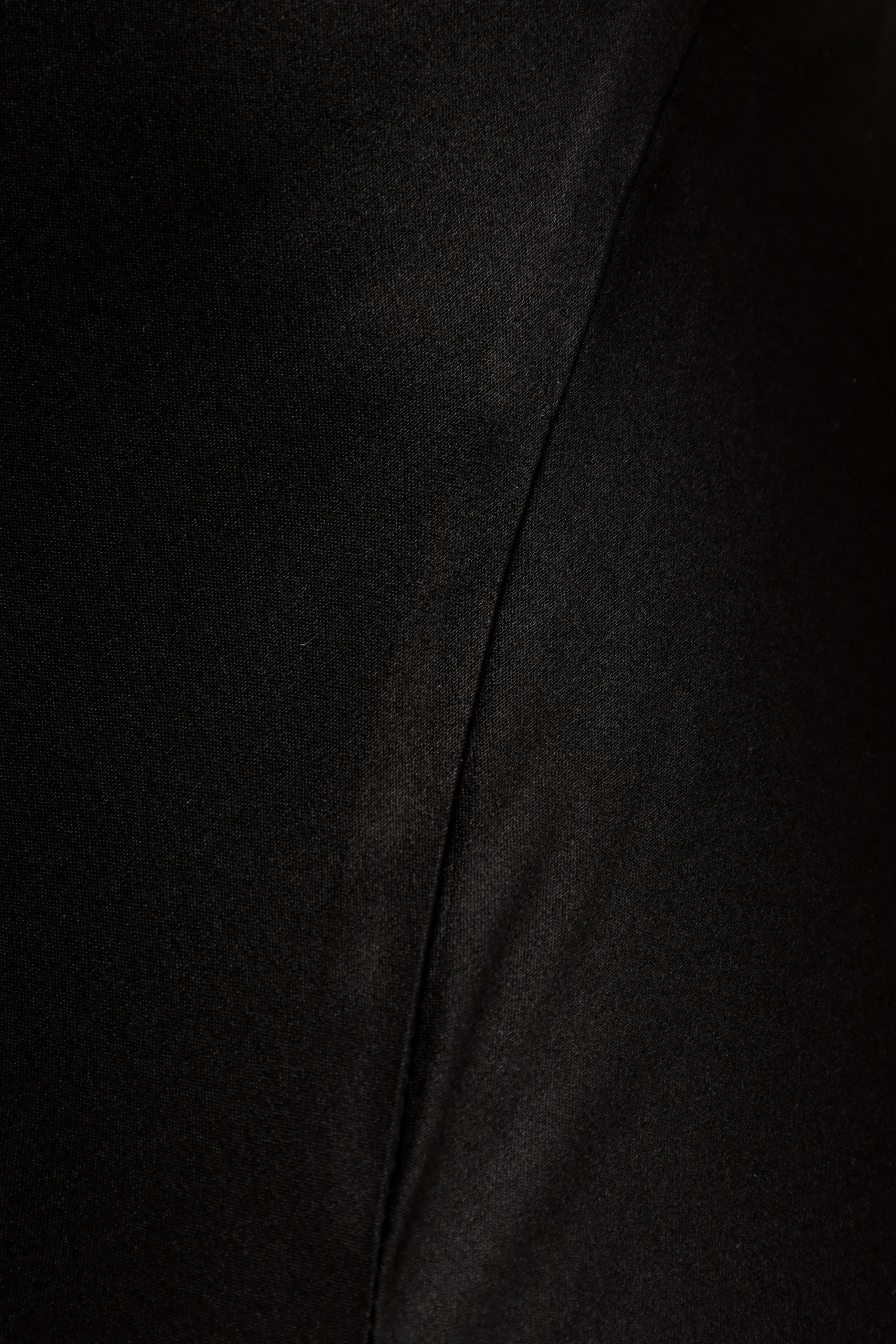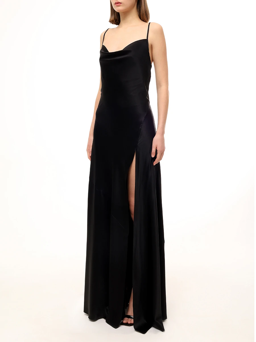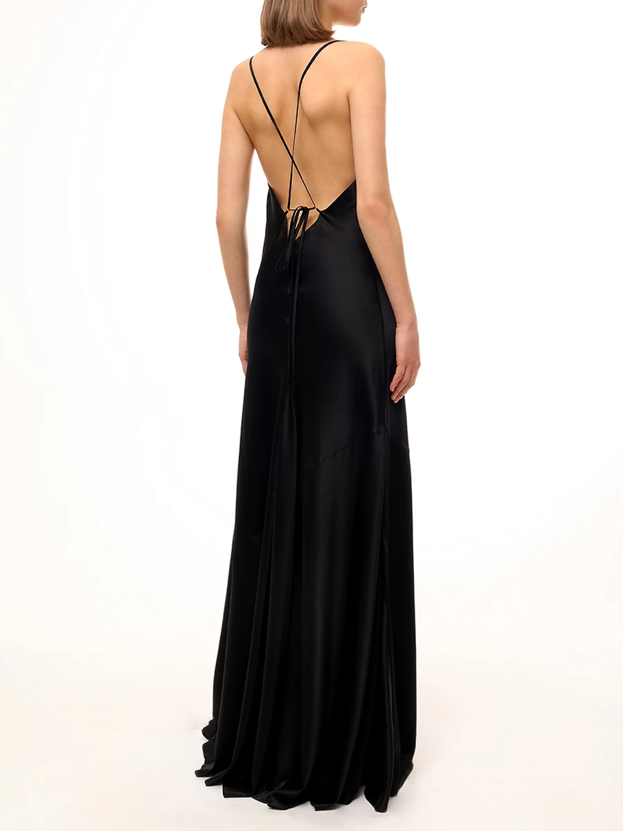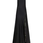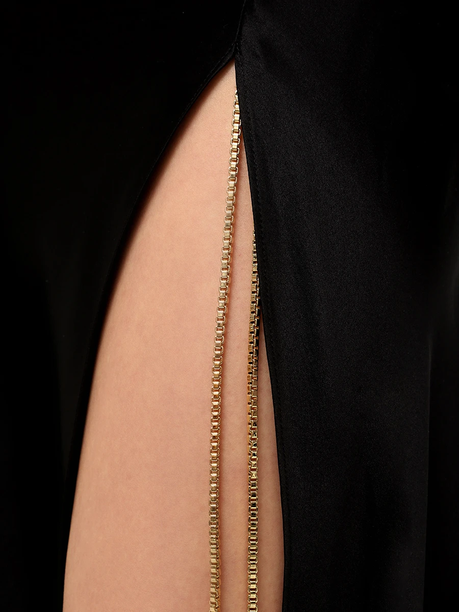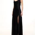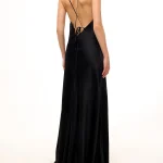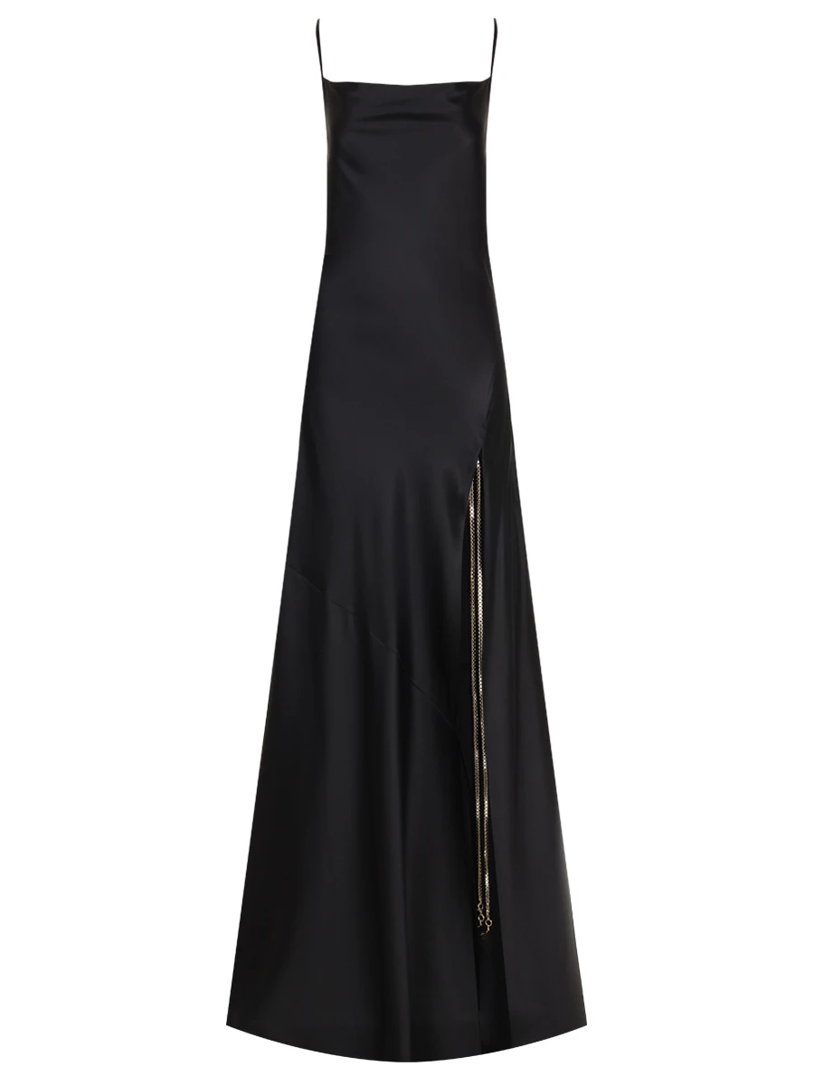 -Черное платье-макси из атласного шелка от DANAME. -Модель с акцентом кроя на талии, юбкой А-силуэта в пол, узкими бретелями на плечах, которые перекрещиваются на спине, драпировкой-качели в зоне декольте. -Вау-эффект создаёт высокий разрез с длинными золотистыми цепочками, которые органично сочетаются с насыщенным цветом.