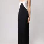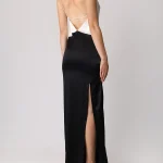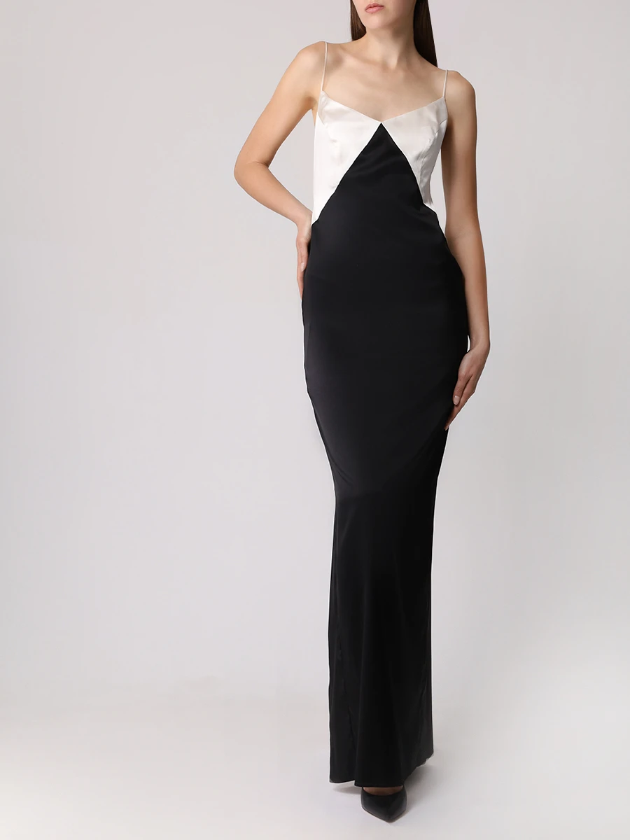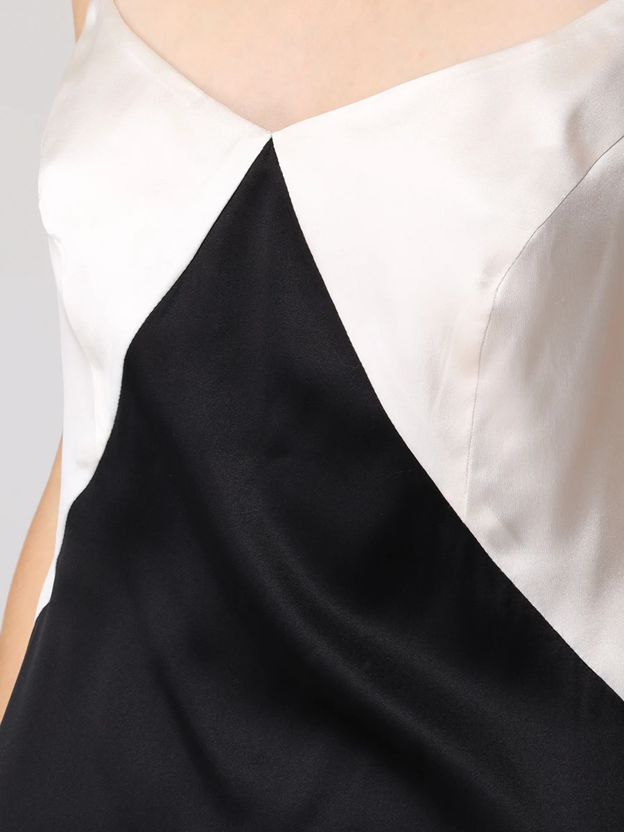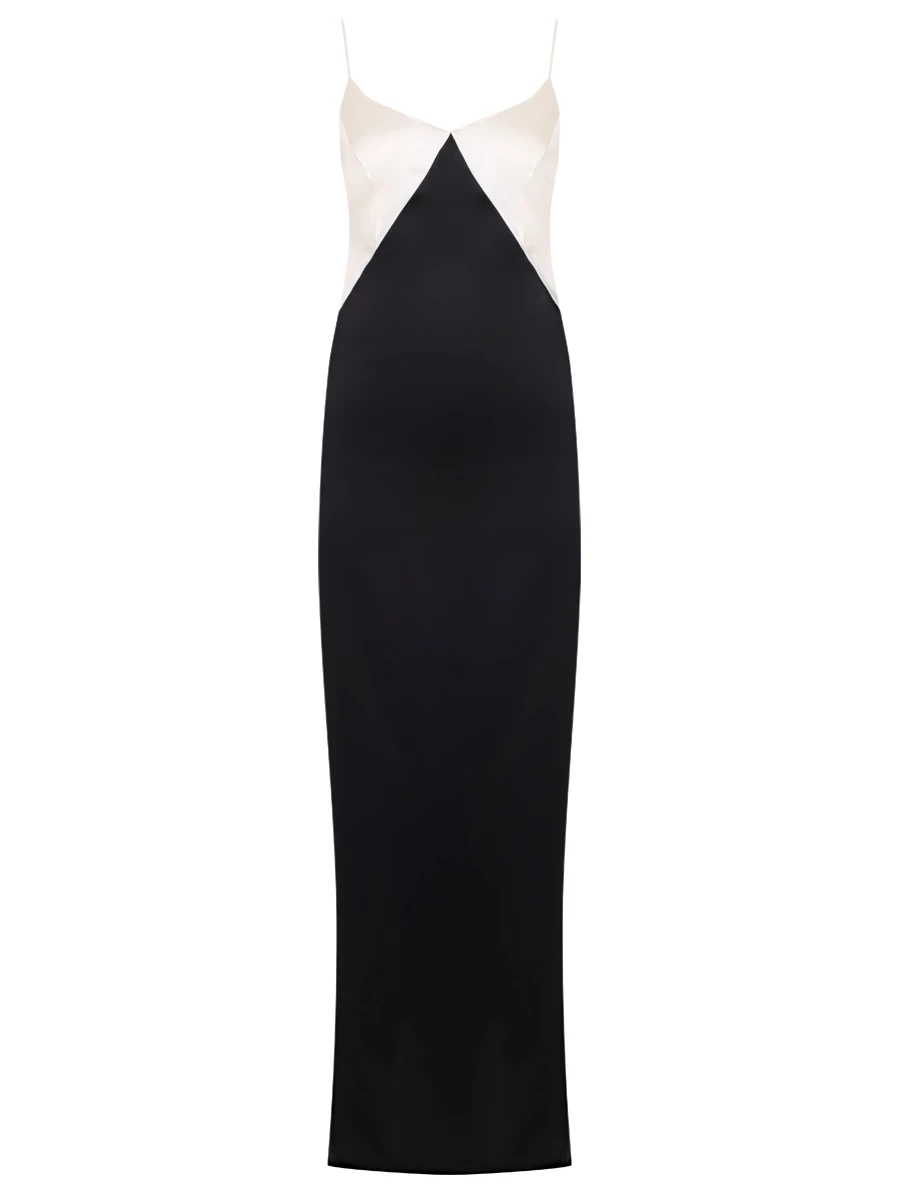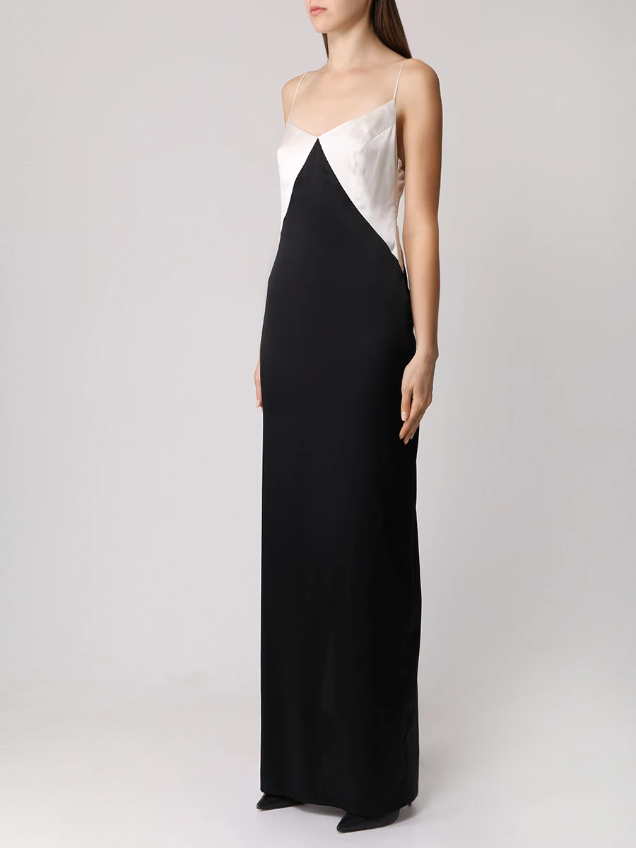 -Платье в стиле колор-блок из тонкого шелка от MASTERSUIT. -Модель приталенного силуэта с глубоким вырезом на спине и узкими регулируемыми бретелями, которые обеспечивают индивидуальную комфортную посадку, высоким разрезом для комфортного шага. -Классические линии кроя платья идеально обрисовывают женственный силуэт.