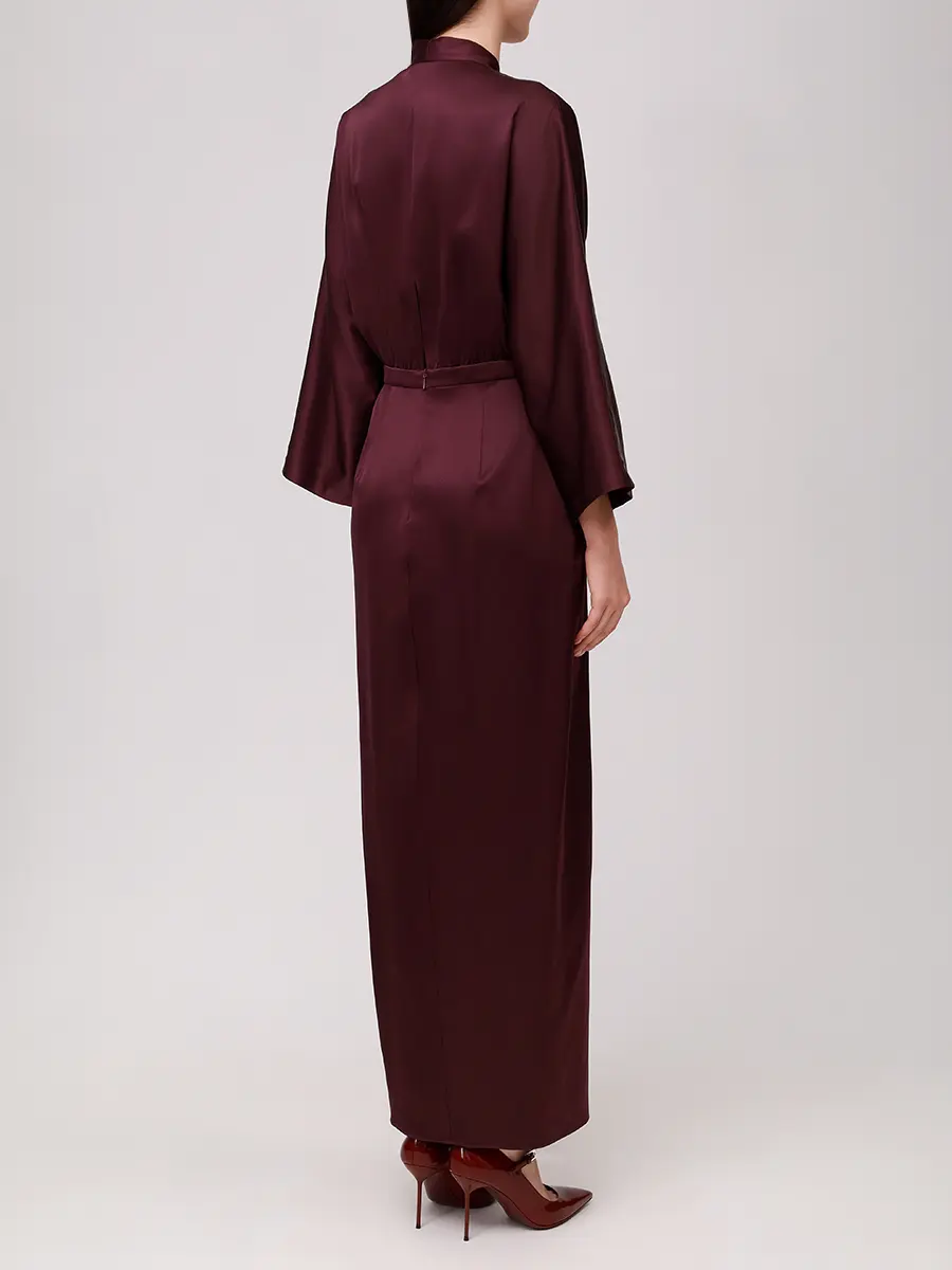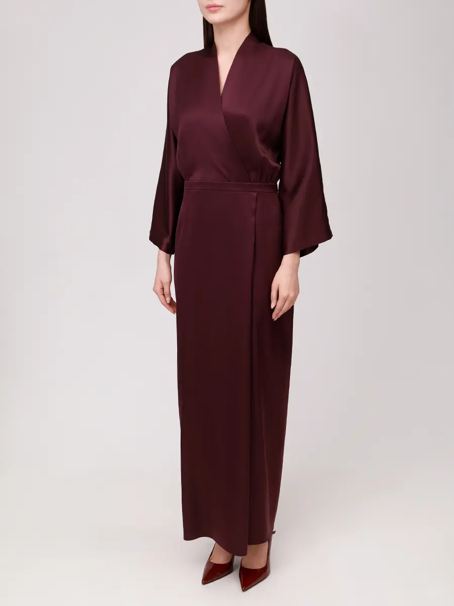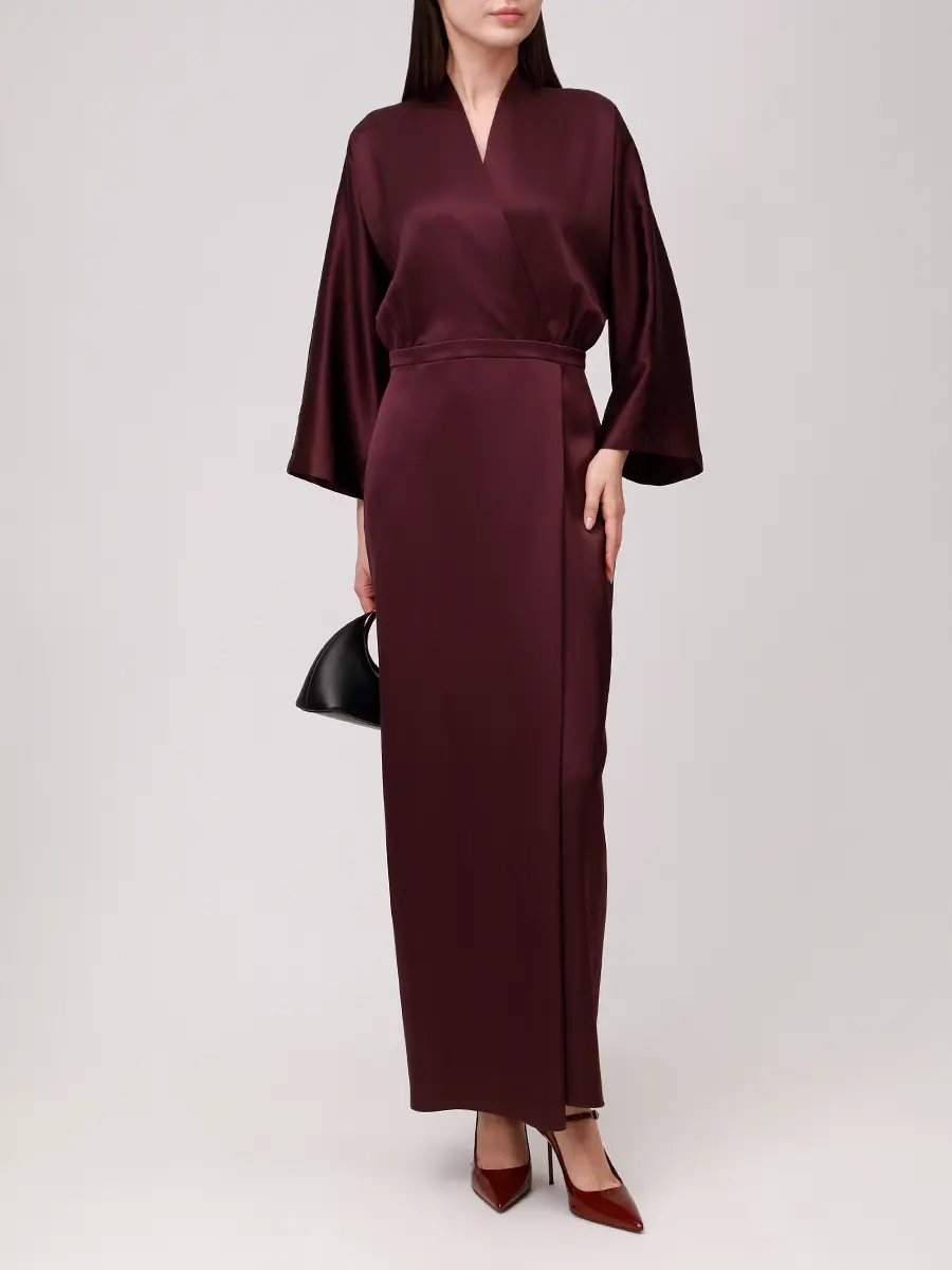 -Платье-макси из шелка сливового цвета от OLOLOL. -Модель с акцентом кроя на талии, укороченными рукавами длины 3/4, V-образным запахом на груди, застежкой на потайную молнию.