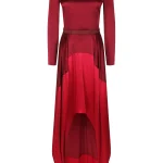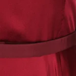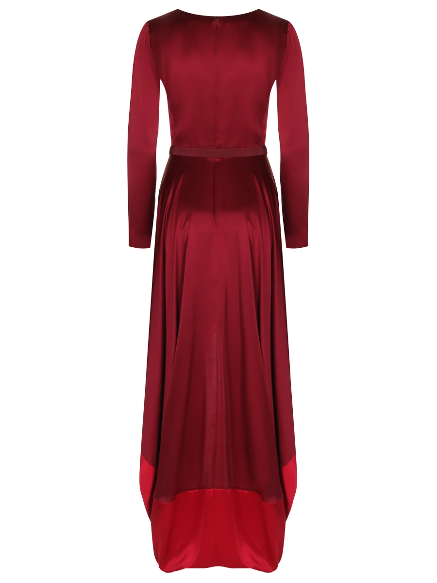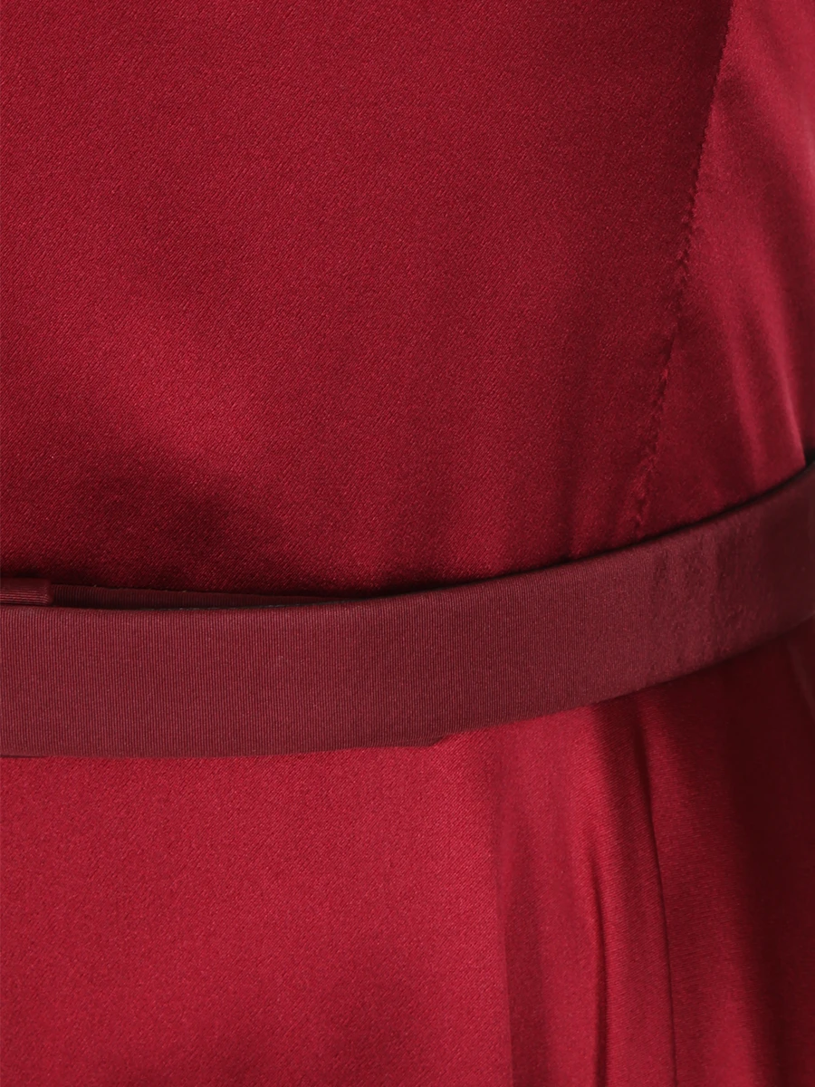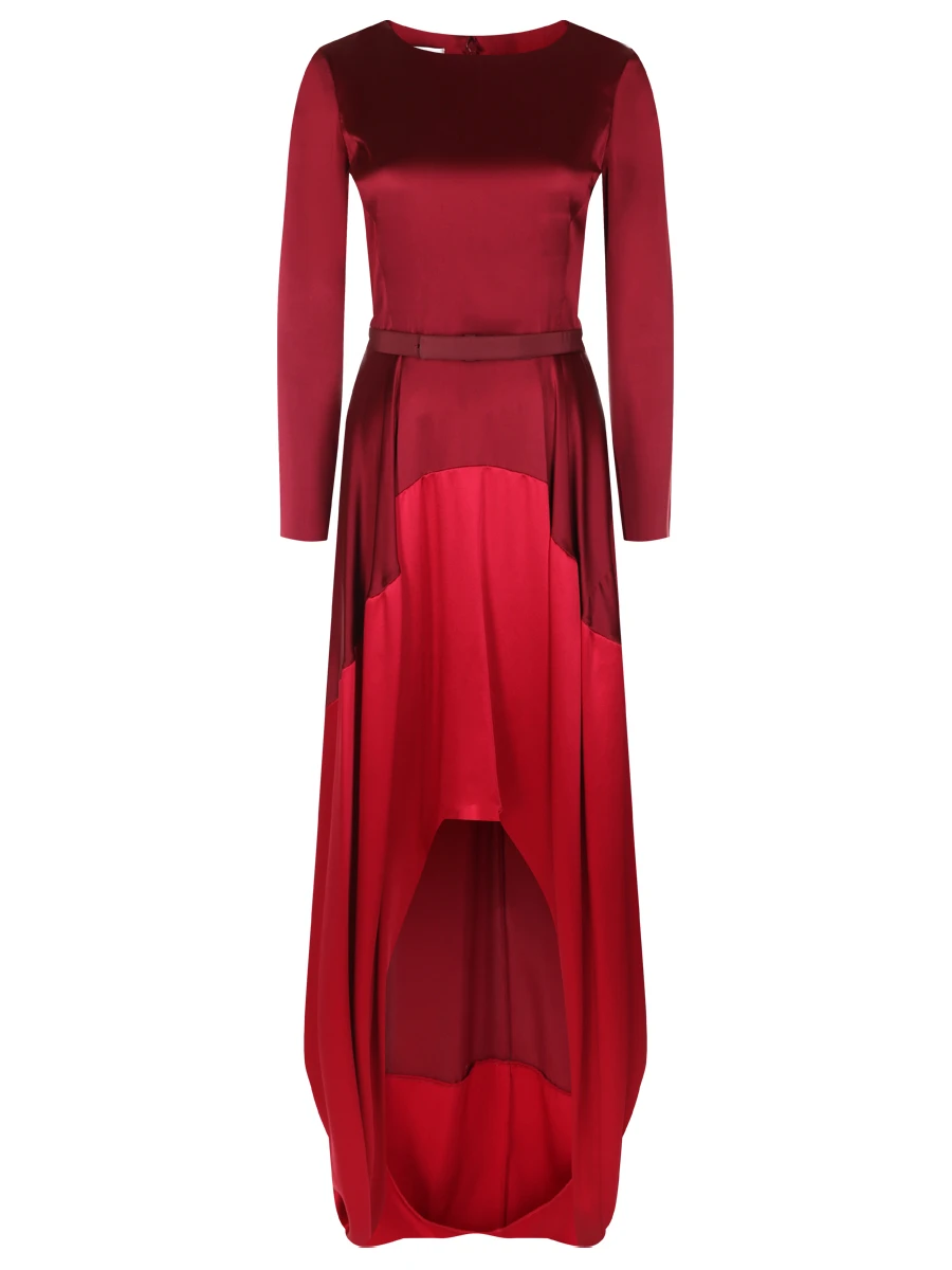 -Бордовое платье из нежного шелка от OSCAR DE LA RENTA. -Модель приталенного кроя с длинными рукавами, круглым вырезом горловины, поясом в тон, асимметричной длины, застежкой на потайную молнию на спинке.