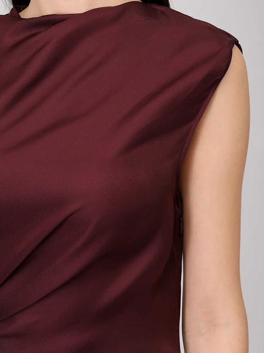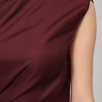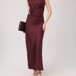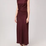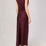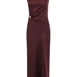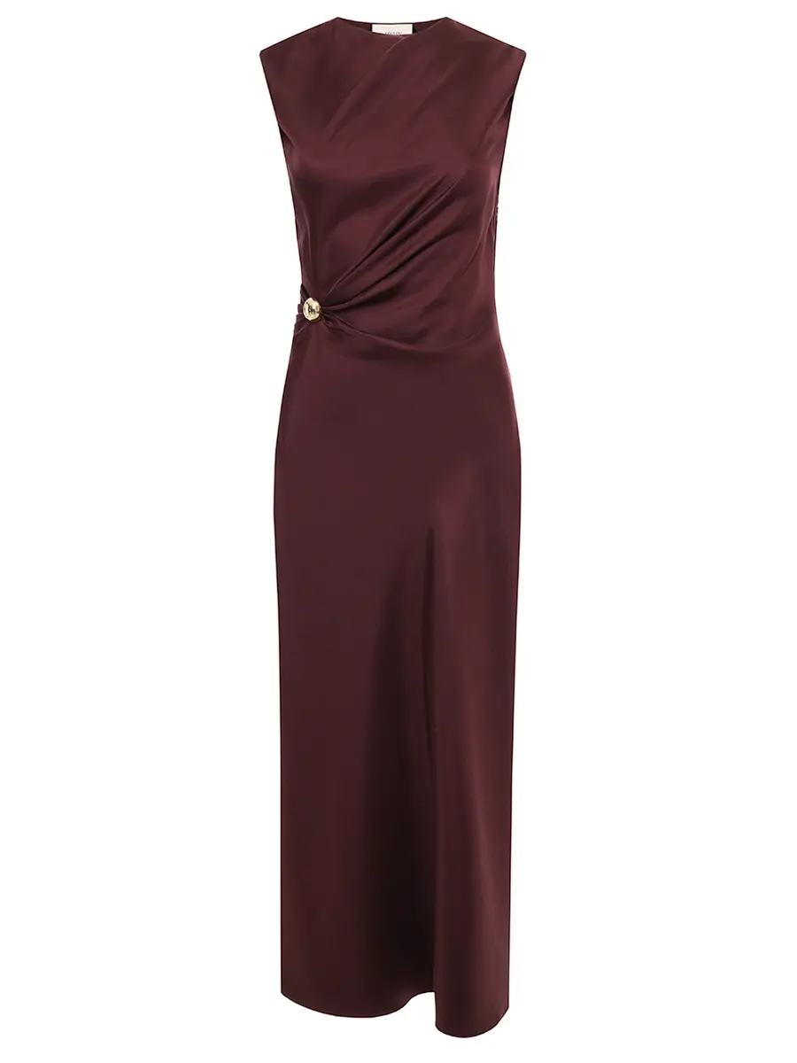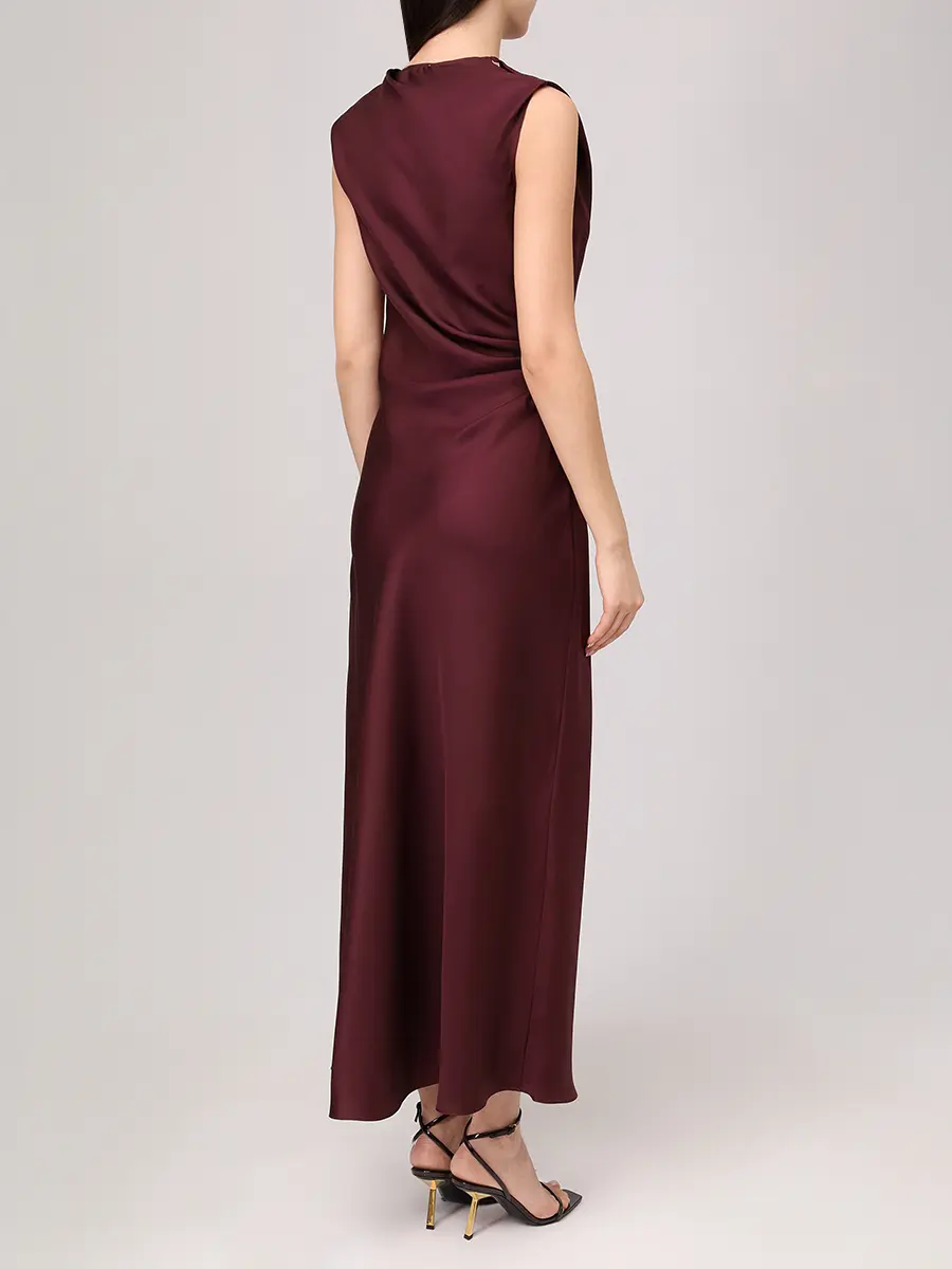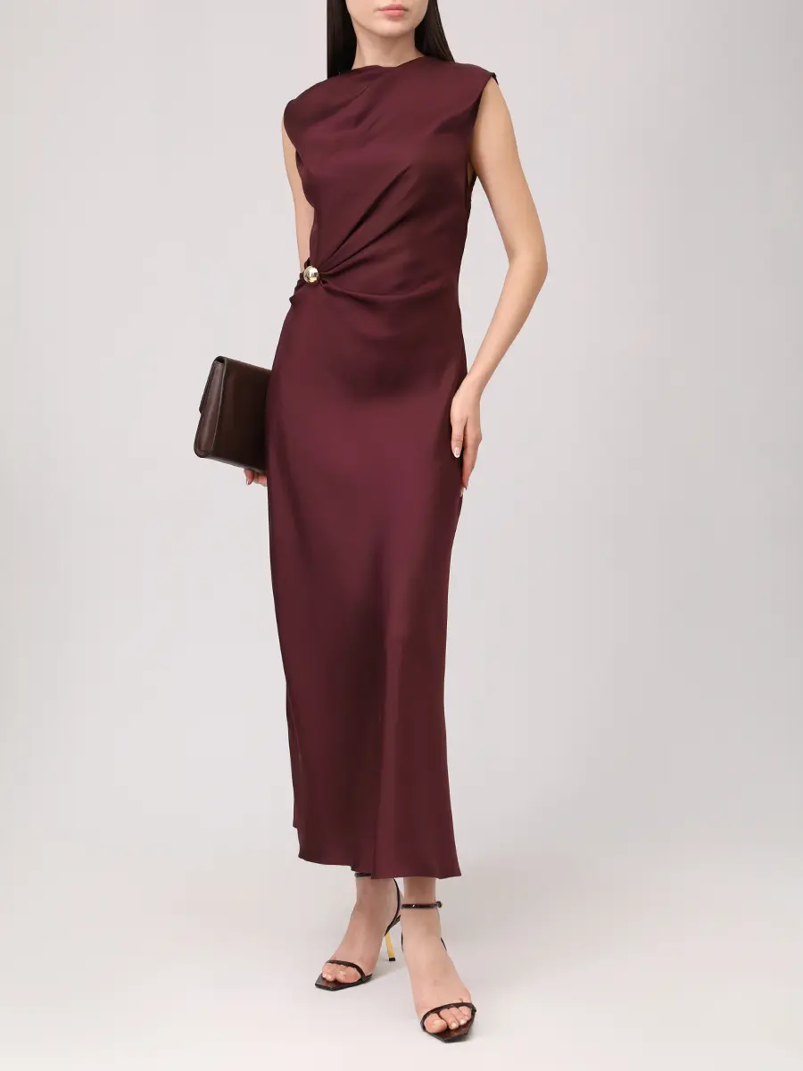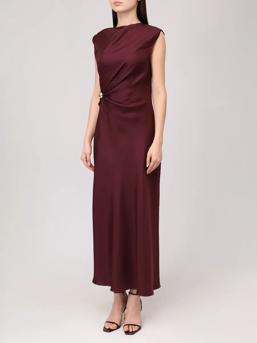 -Бордовое платье-макси из шелка от LOULOU DE SAISONS. -Модель приталенного кроя с круглым вырезом под горло, драпировкой на талии, которую фиксирует полусфера в золоте.