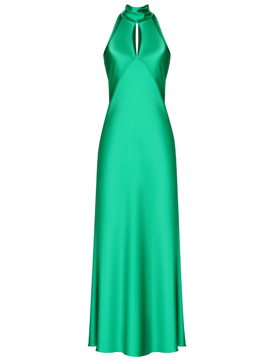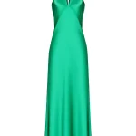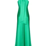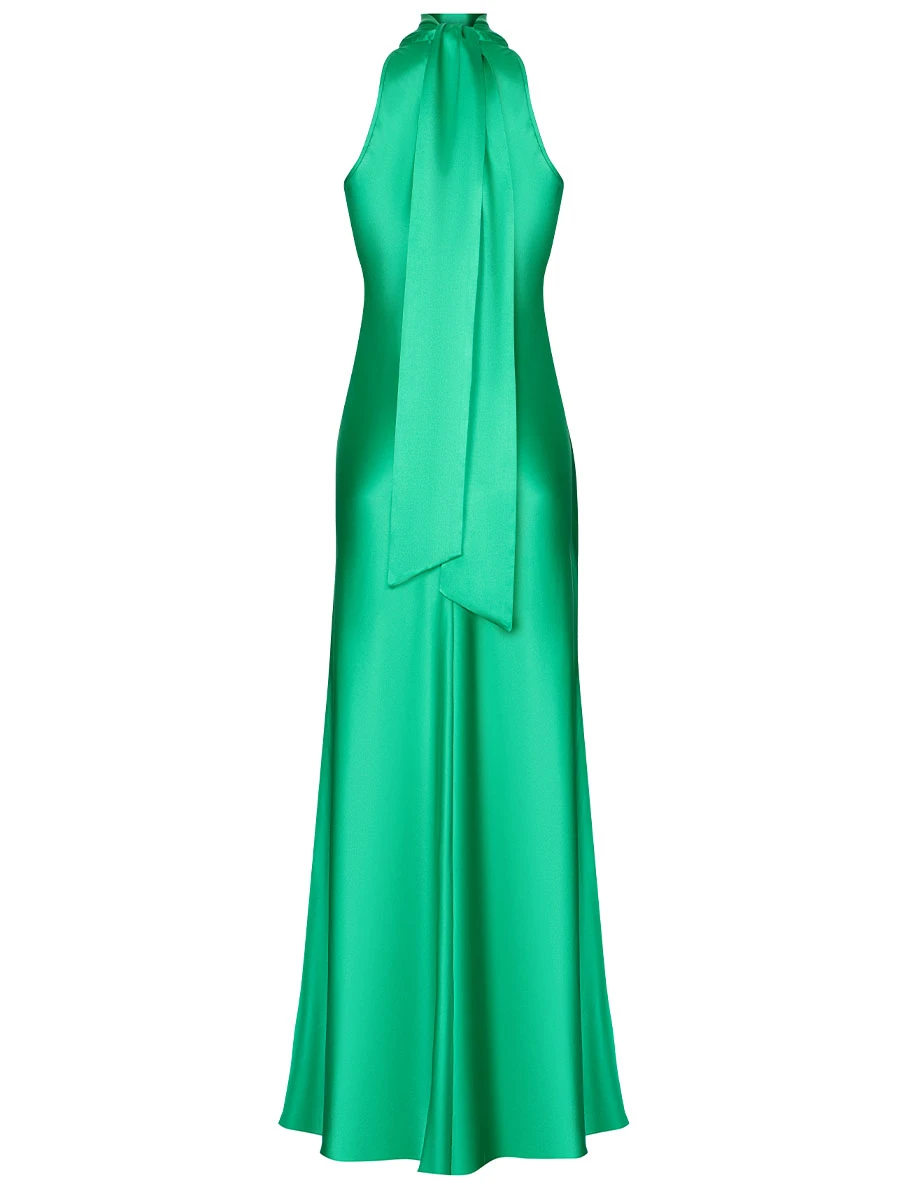 -Изумрудное платье из шелка от ST. ERME. -Облегающий крой подчеркивает бедра и талию, вырез-капля на груди, воротник-стойка с длинными завязками на бант.