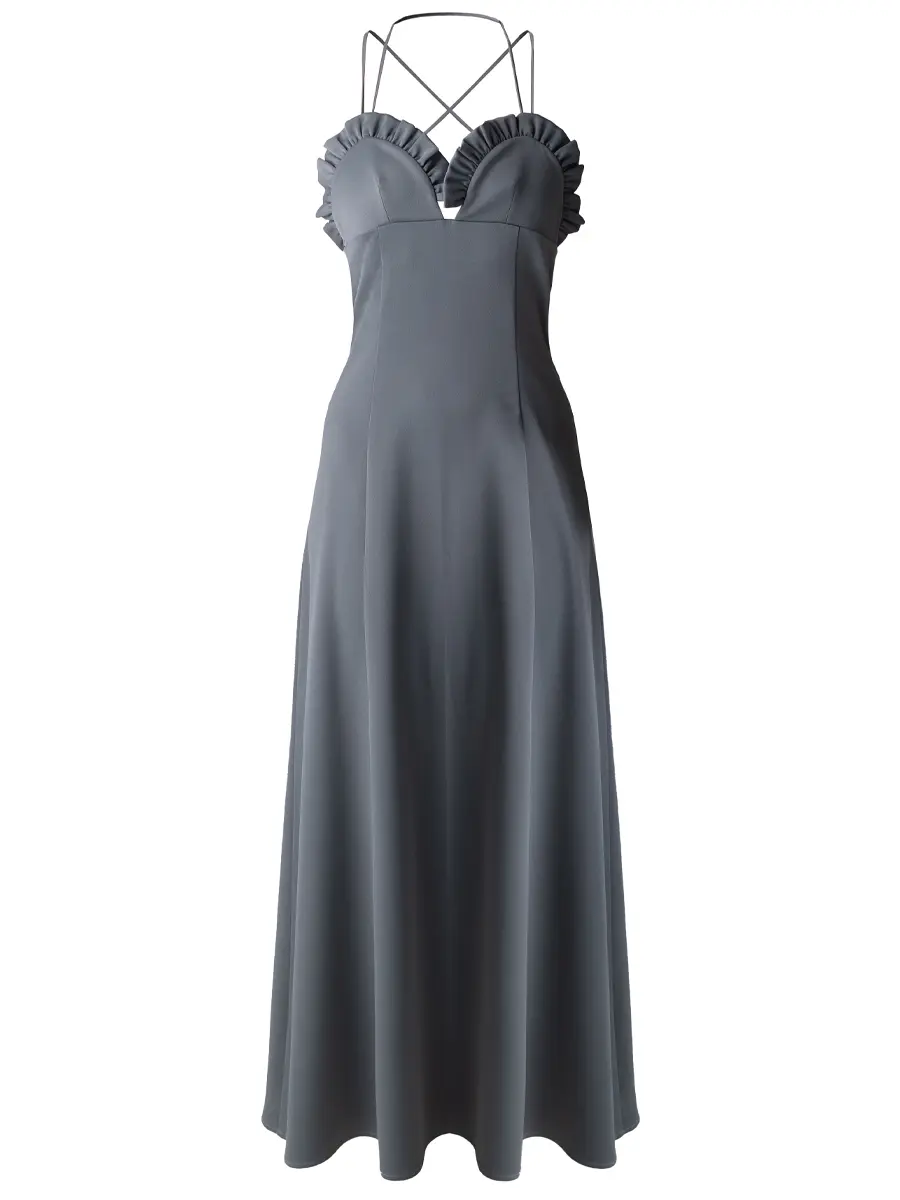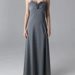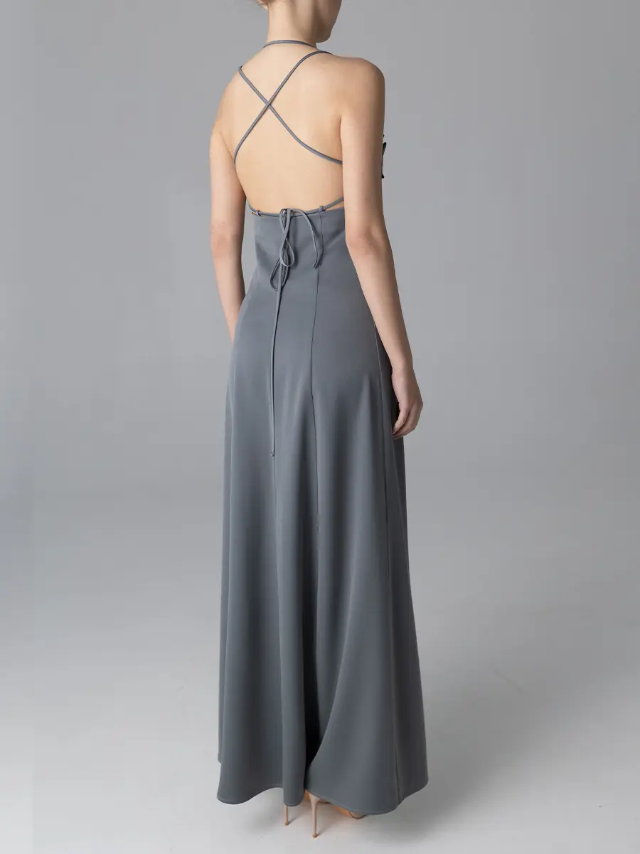 -Серое платье-макси из смесового шелка от BÜRO UNIQUE. -Модель приталенного кроя, деликатно облегающего талию и бедра, узкими бретелями и шнуровкой. -Минималистичный дизайн и отсутствие рукавов делают это платье идеальным выбором для особых случаев, подчеркивая женственность и стиль. Изделие подходит на размер 40-42. Условия доставки: данный товар отправляется только в случае полной предоплаты до его отправления.
