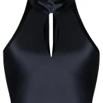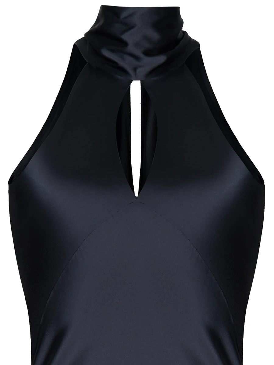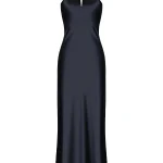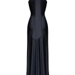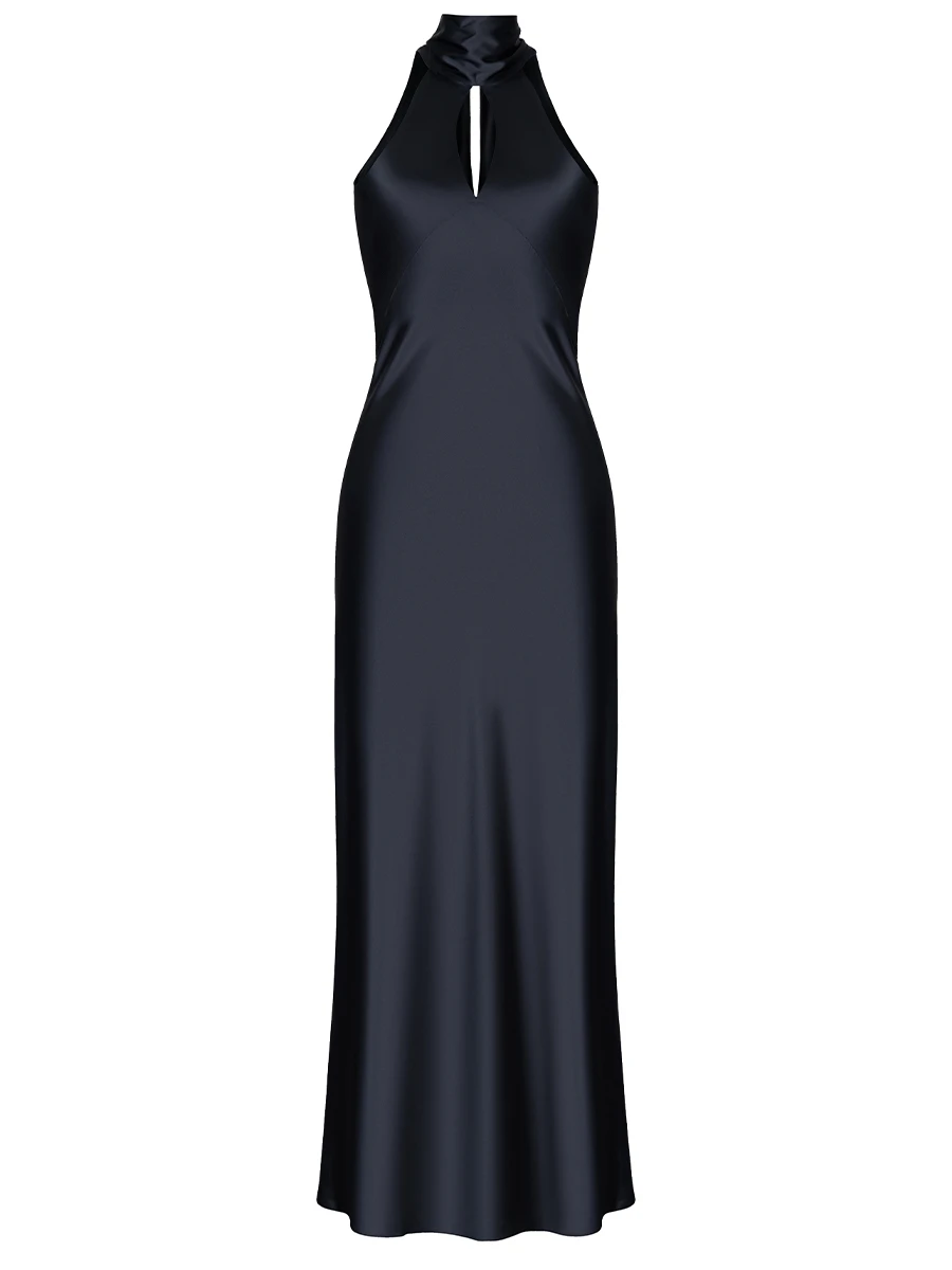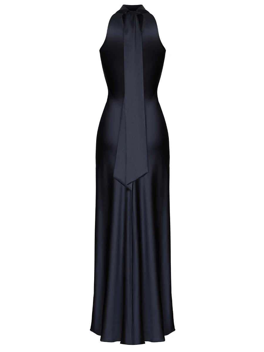 -Черное платье из шелка от ST. ERME. -Приталенный силуэт, длина макси, вырез-капля на груди, воротник-стойка с длинными завязками на бант.