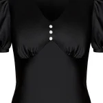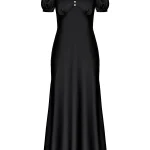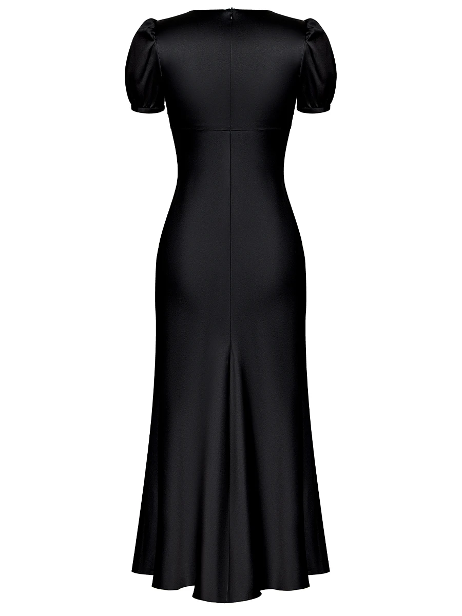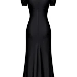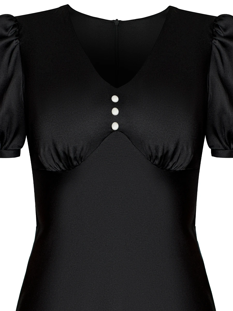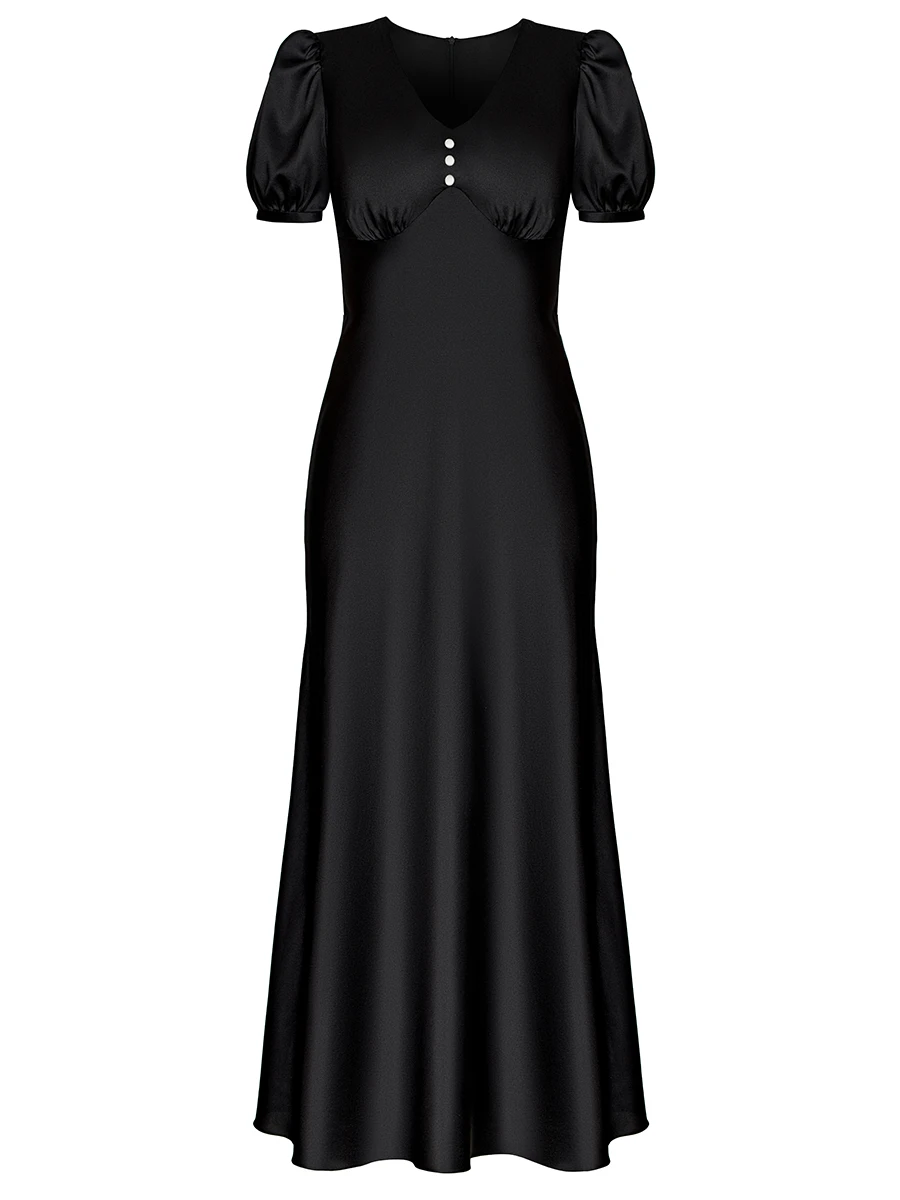 -Черное платье из нежного шелка от ST. ERME. -Модель приталенного кроя, деликатно облегающего талию и бедра, V-образным вырезом на груди, короткими рукавами и застежкой на потайную молнию на спинке. -Классические линии кроя платья идеально обрисовывают женственный силуэт.
