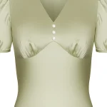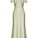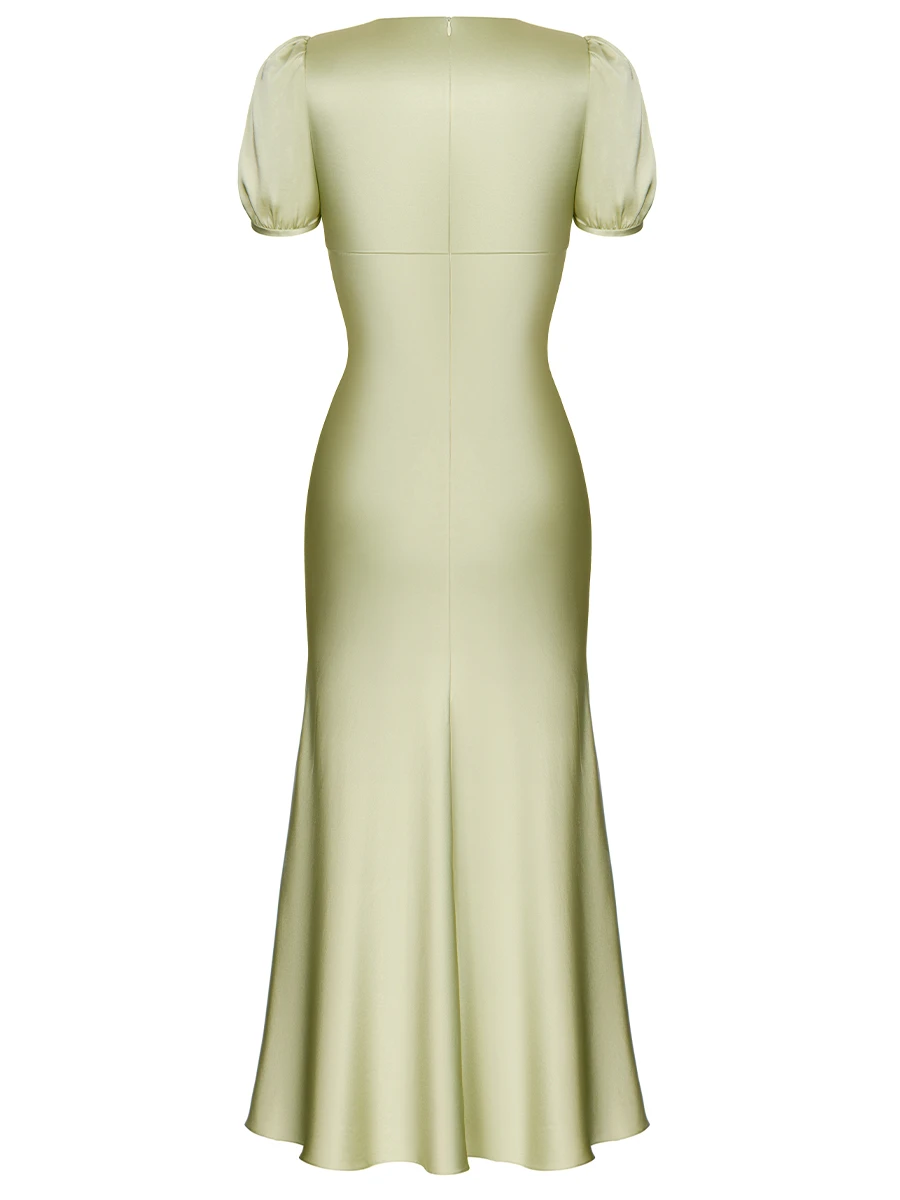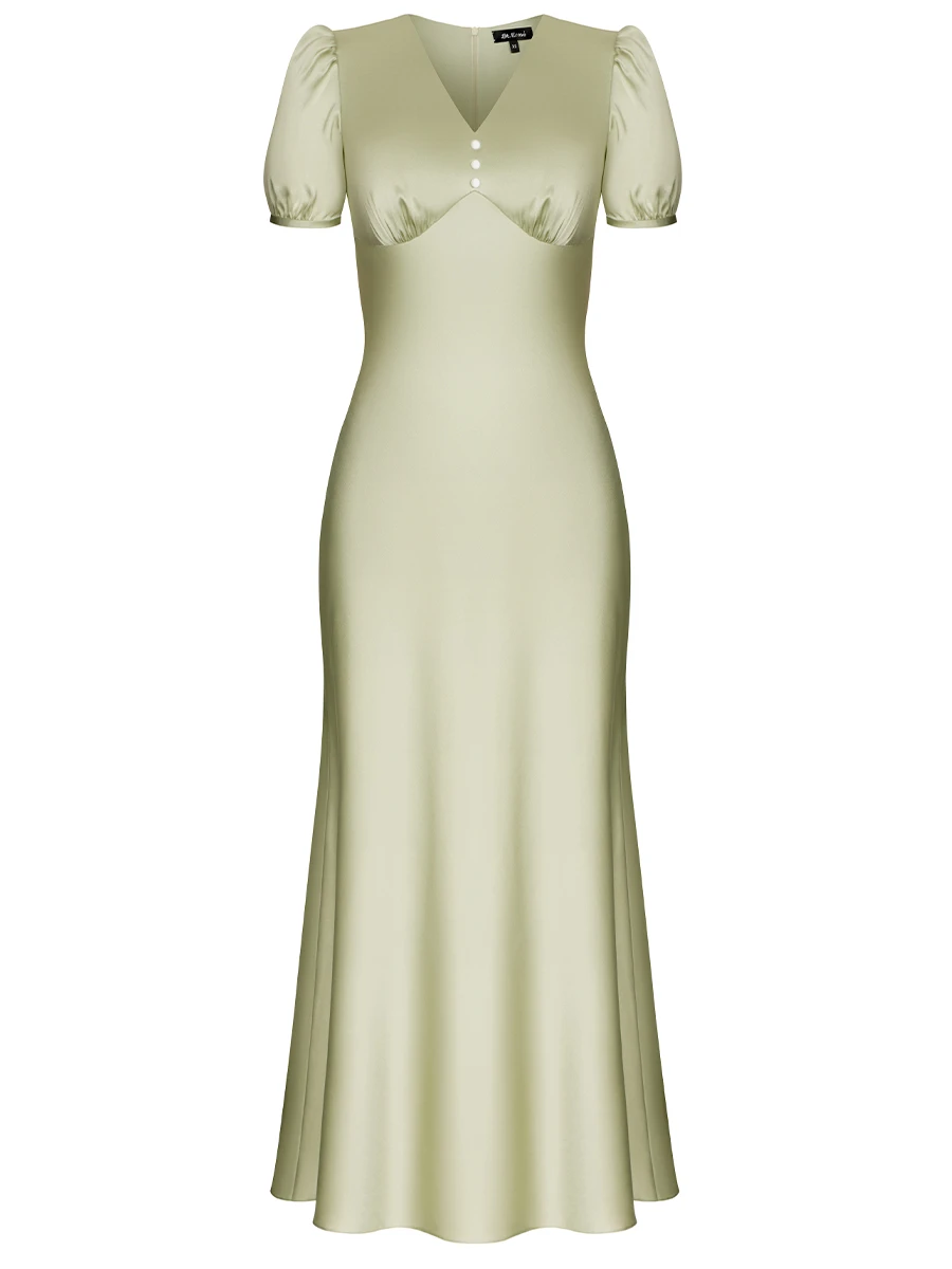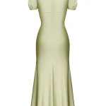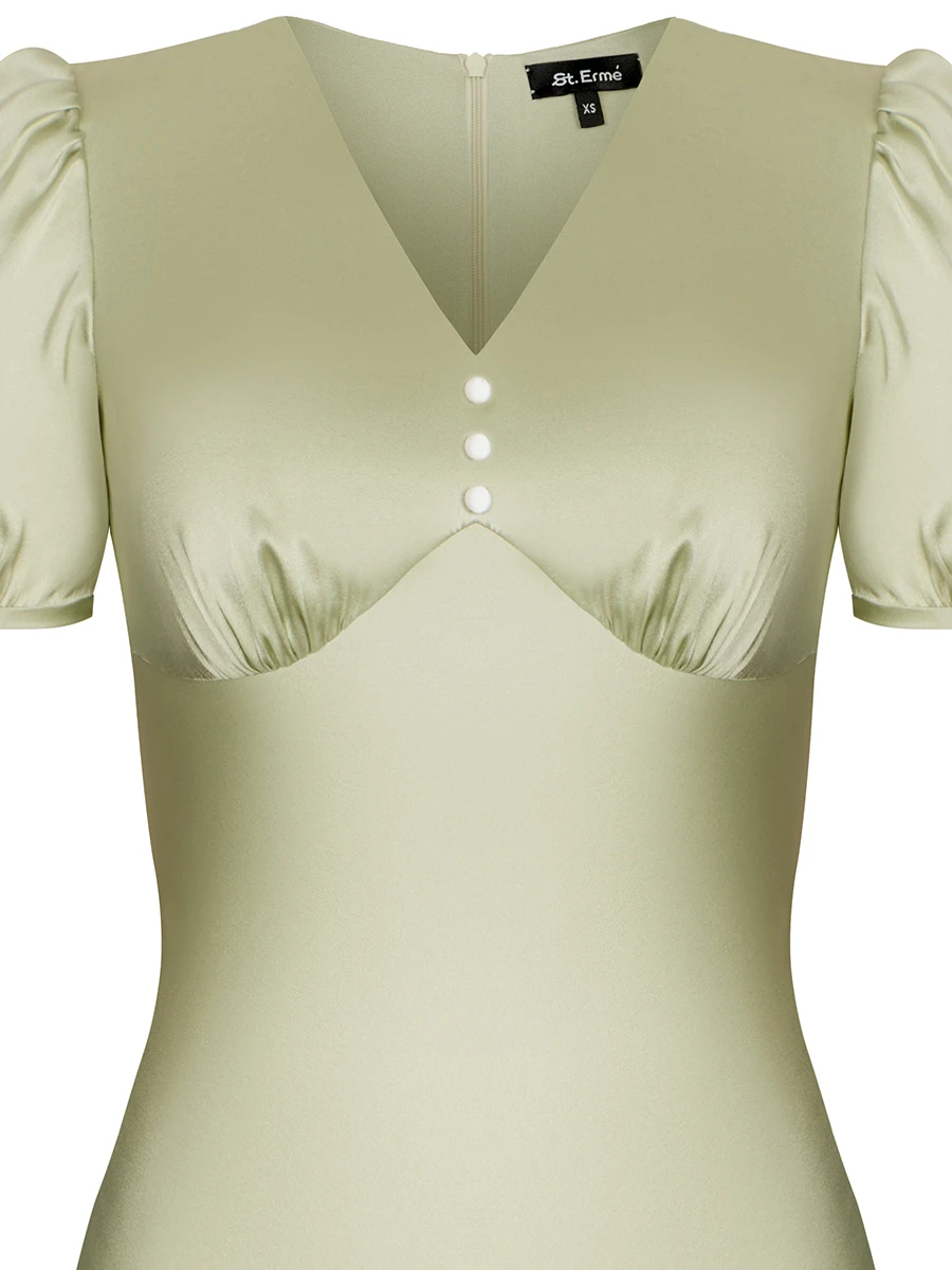 -Зеленое платье из нежного шелка от ST. ERME. -Модель приталенного кроя, деликатно облегающего талию и бедра, V-образным вырезом на груди, короткими рукавами с узкими манжетами и застежкой на потайную молнию на спинке. -Классические линии кроя платья идеально обрисовывают женственный силуэт.
