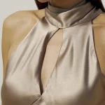 -Платье из нежного шелка песочного оттенка от ST. ERME. -Модель приталенного кроя, деликатно облегающего талию и бедра, с вырезом-каплей на груди и воротником-стойкой с длинными завязками на бант. -Классические линии кроя платья идеально обрисовывают женственный силуэт.