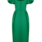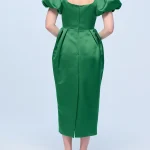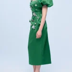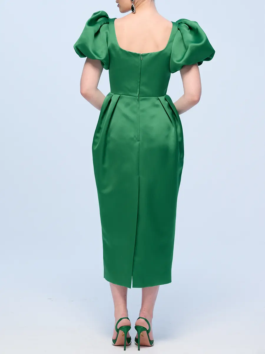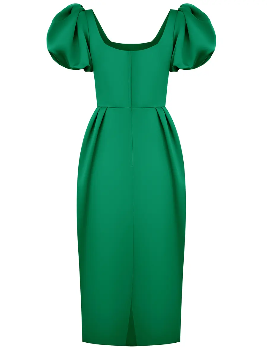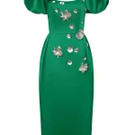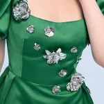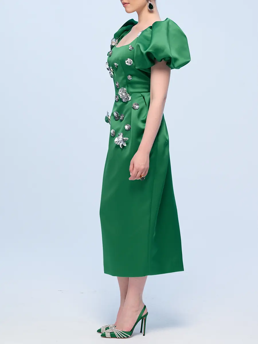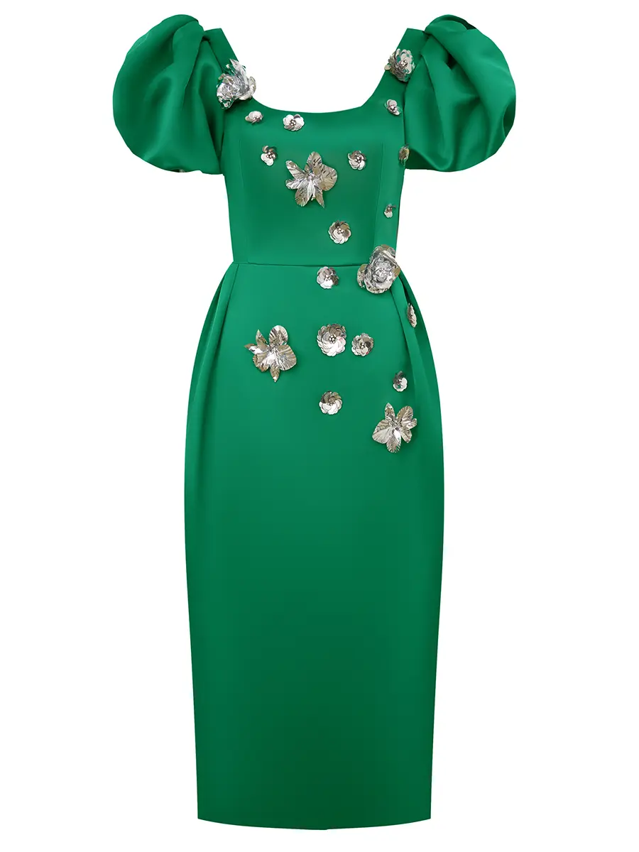 -Ярко-зеленое приталенное платье-футляр из атласного сатина длины-миди с серебряной цветочной аппликацией, выполненной вручную, от THE NAMES. -Платье подчеркивает фигуру, повторяя все линии силуэта.