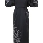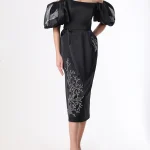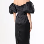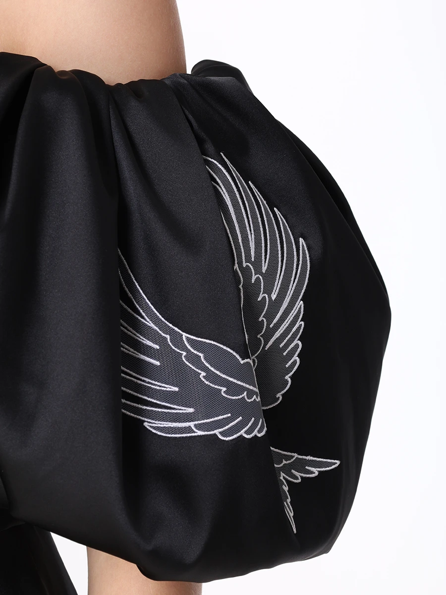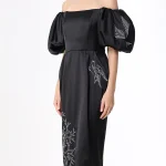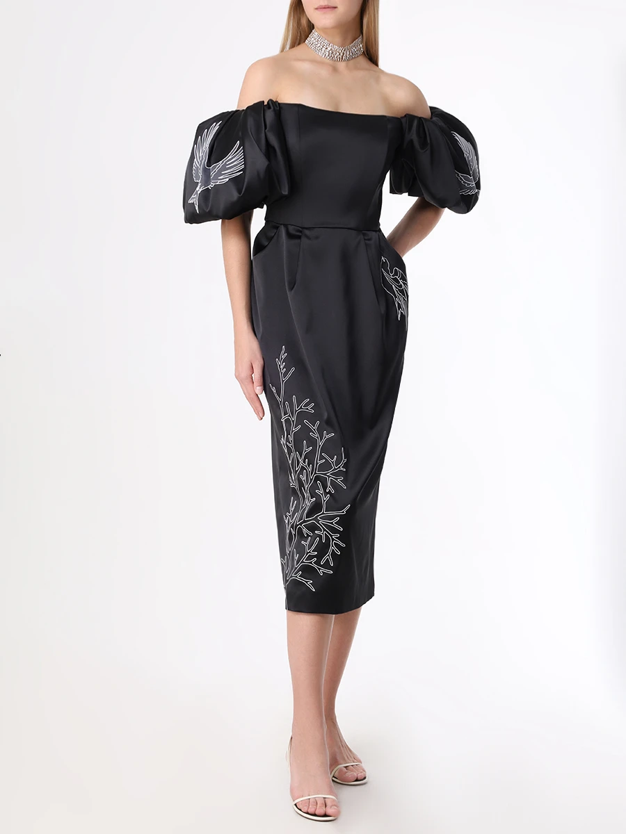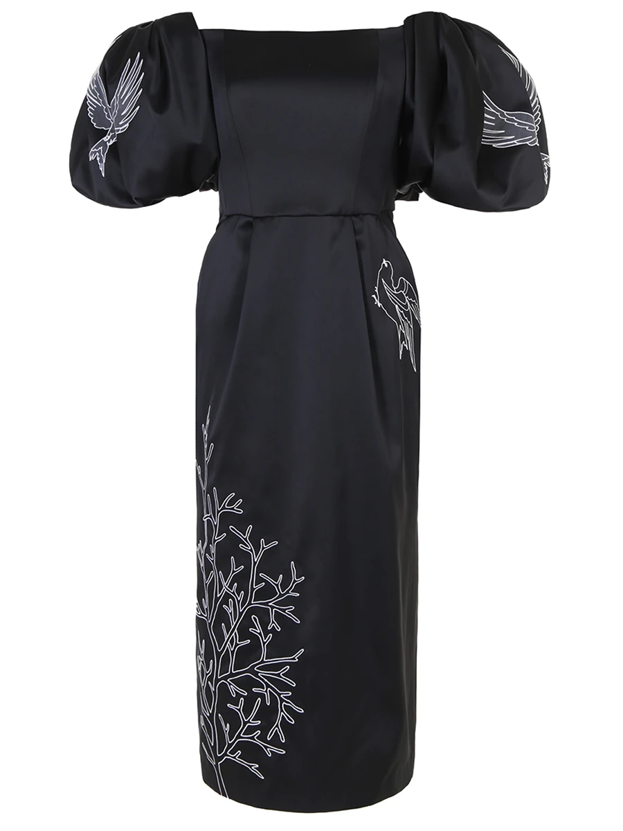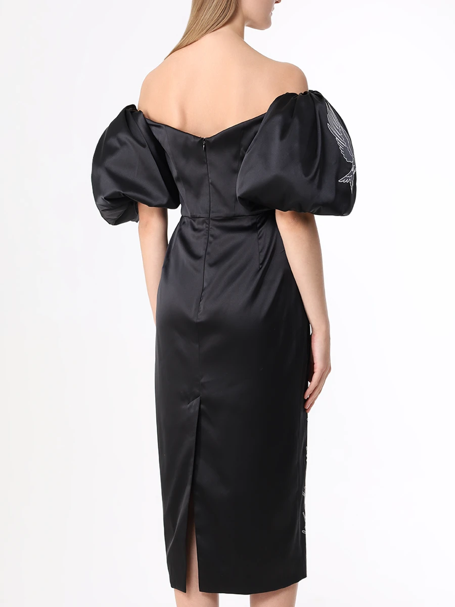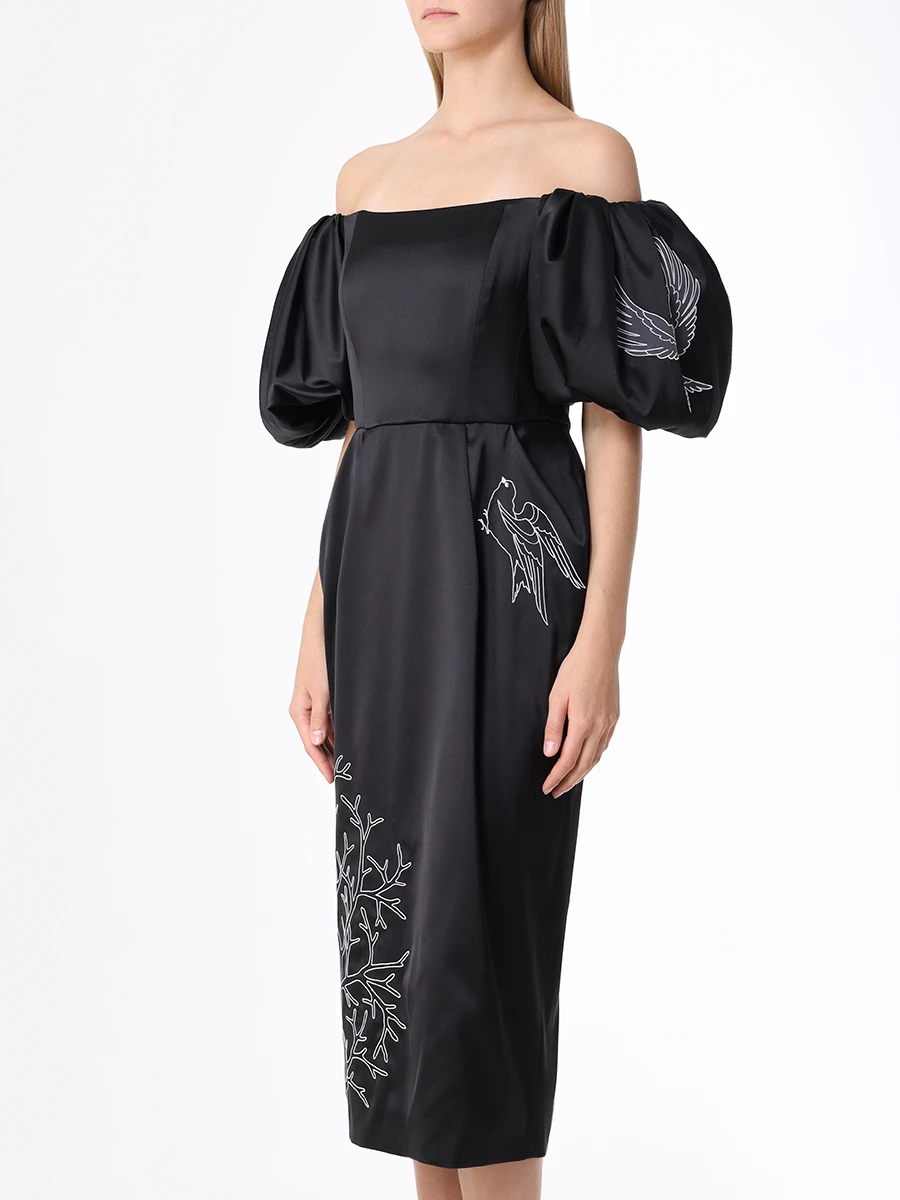-Черное платье-миди из атласного шелка от YANINA. -Модель с акцентом кроя на высокой отрезной талии, спущенной линией плеча, открытой линией декольте, короткими объемными рукавами, защипами на юбке, застежкой на потайную молнию и шлицей сзади. -Платье декорировано контрастной вышивкой на рукавах и подоле.