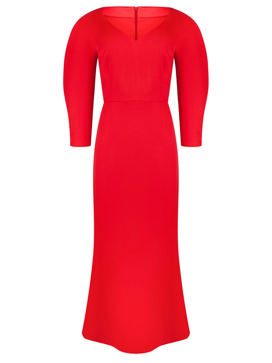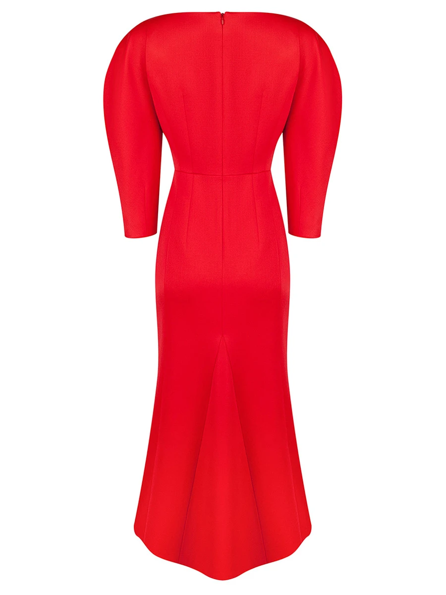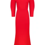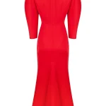 -Красное платье-миди из тонкой шерсти от SHERVARLI. -Основными акцентными деталями изысканного утонченного платья глубокого алого цвета являются фактурные рукава, благородный вырез, подчеркивающий ключицы и аккуратный шлейф сзади. -Это платье — Ваш изумительный спутник для особенных случаев, в рамках которых именно Вы станете объектом внимания и восхищения.