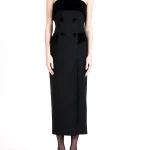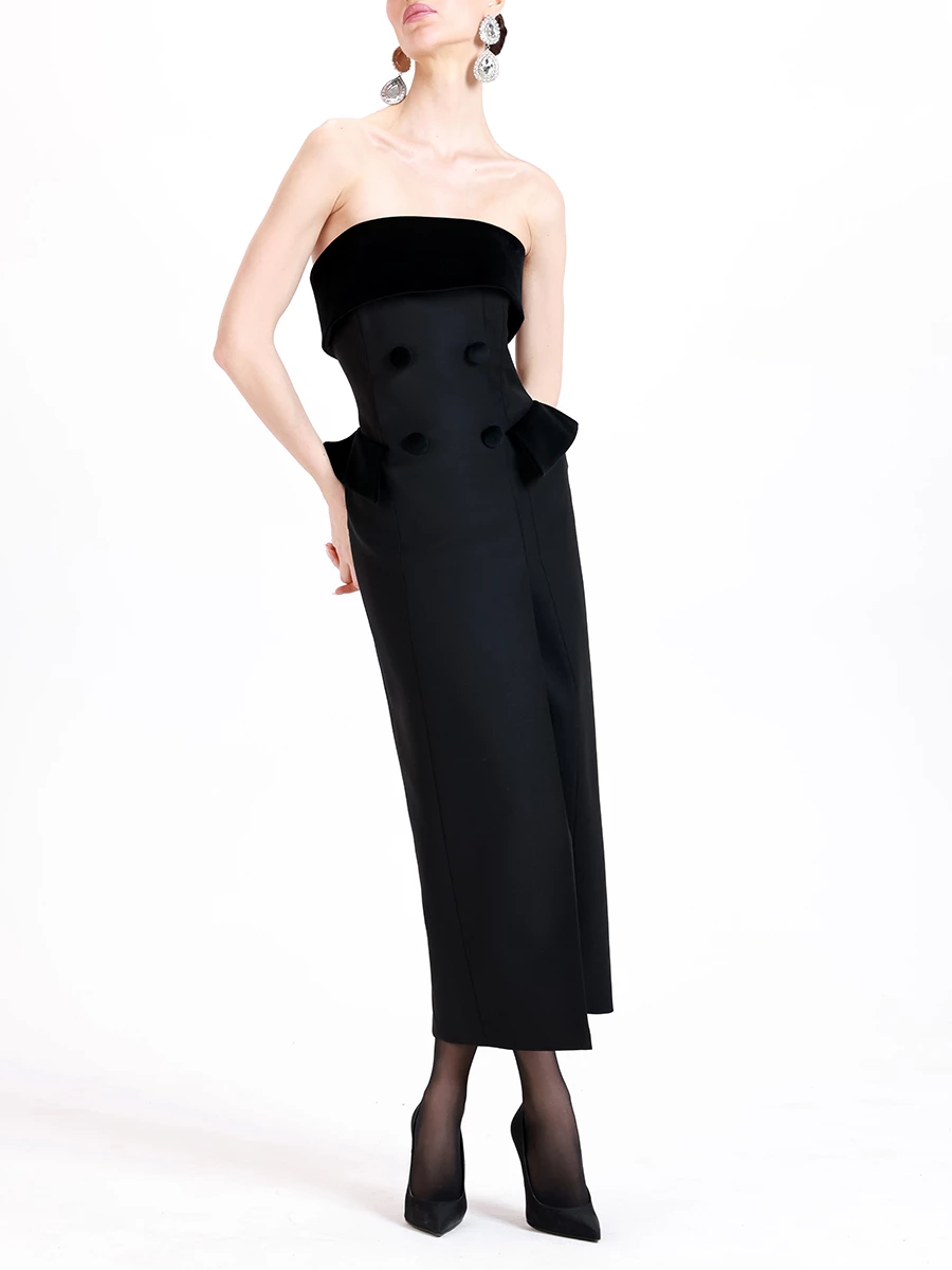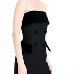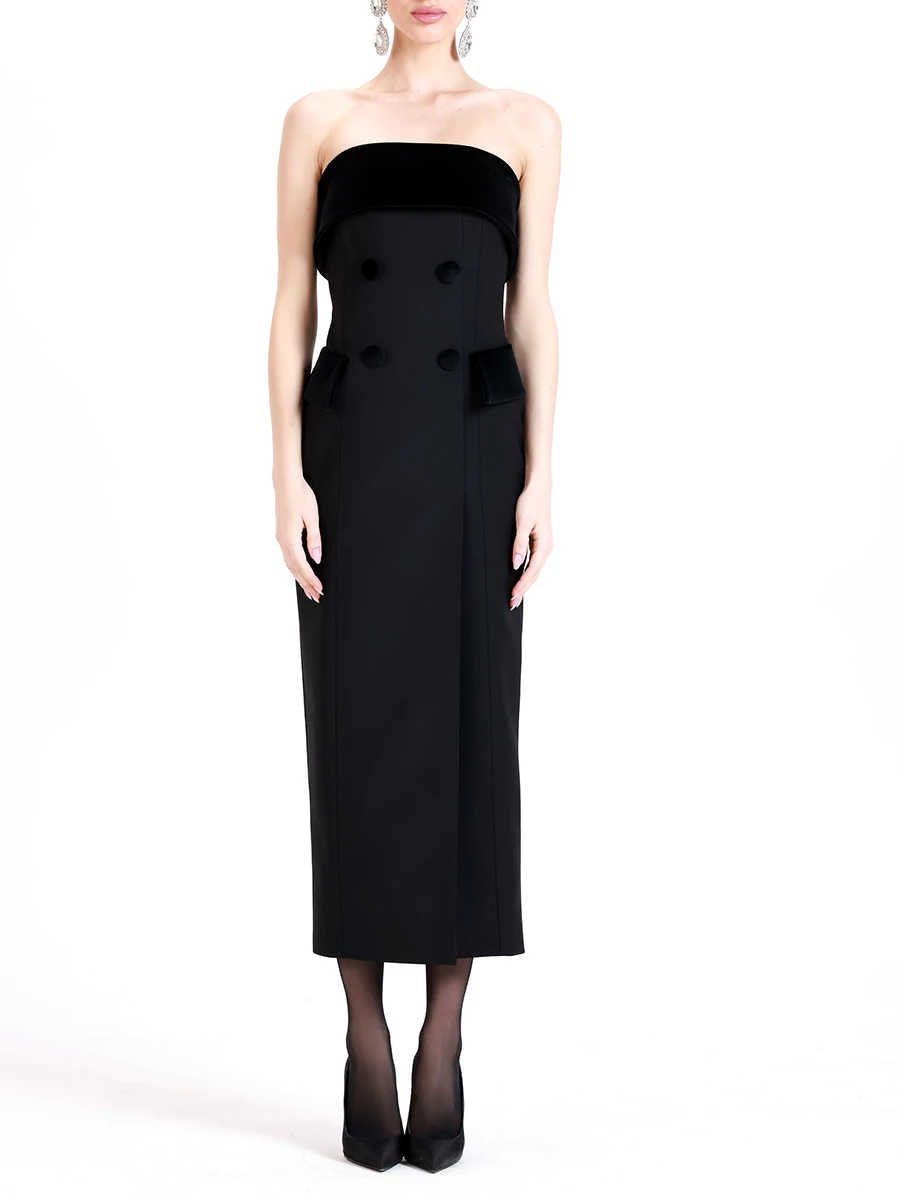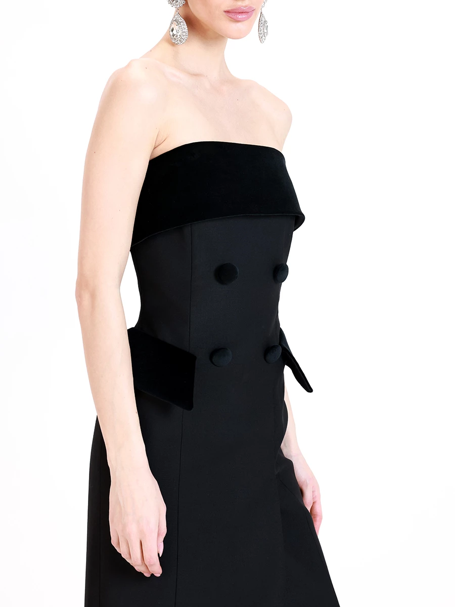 -Черное платье-смокинг из премиальной шерсти от SHERVARLI. -Модель приталенного силуэта с открытой линией плеч и фигурным декольте дополнено благородными бархатными акцентными деталями. -Платье будет выглядеть изысканно, утонченно и элегантно на любом мероприятии.