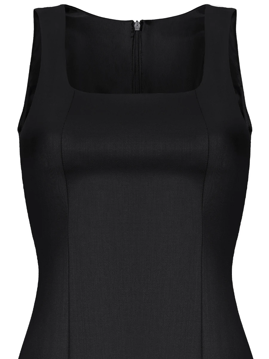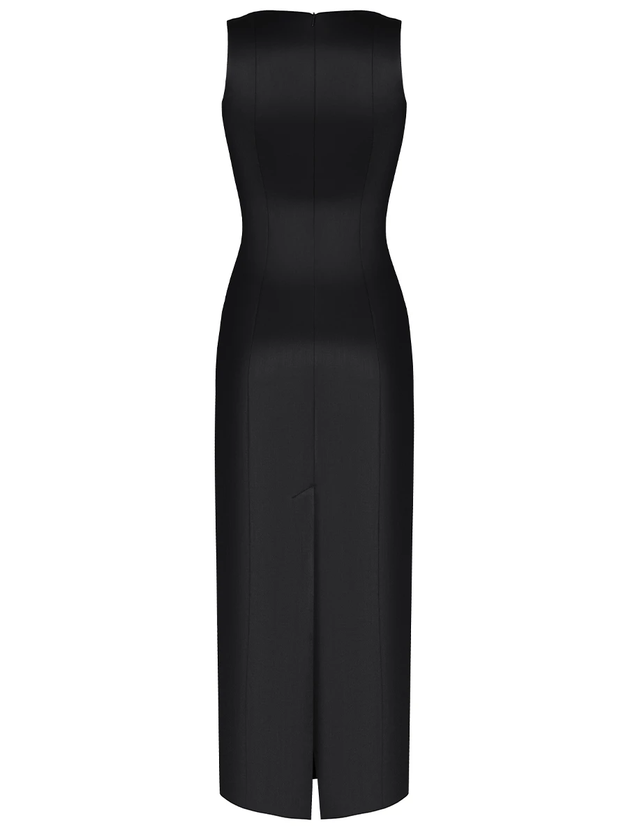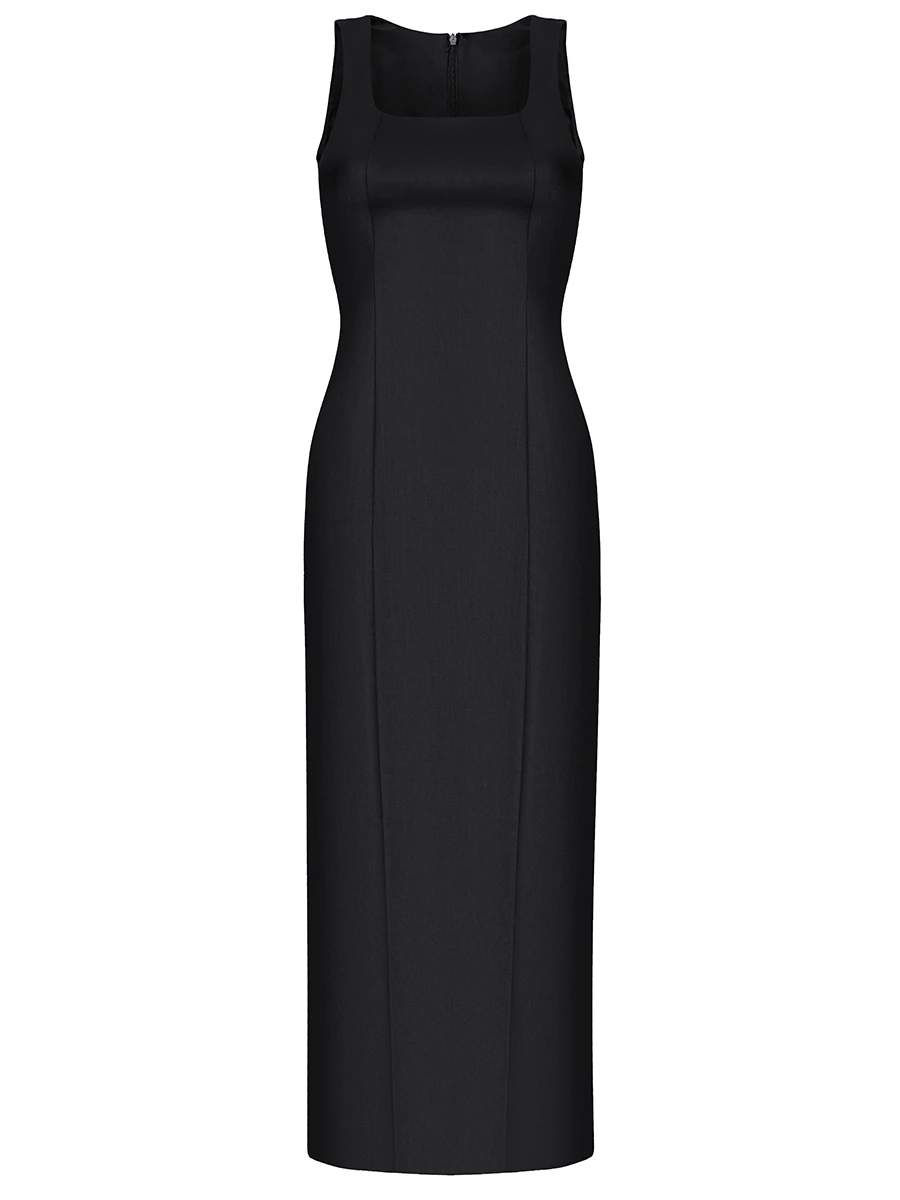 -Лаконичное платье-макси из шерсти от ST. ERME. -Крой модели повторяет изгибы тела, подчеркивая талию и бедра, вырез-каре, шлица, застежка на потайную молнию.