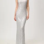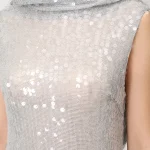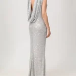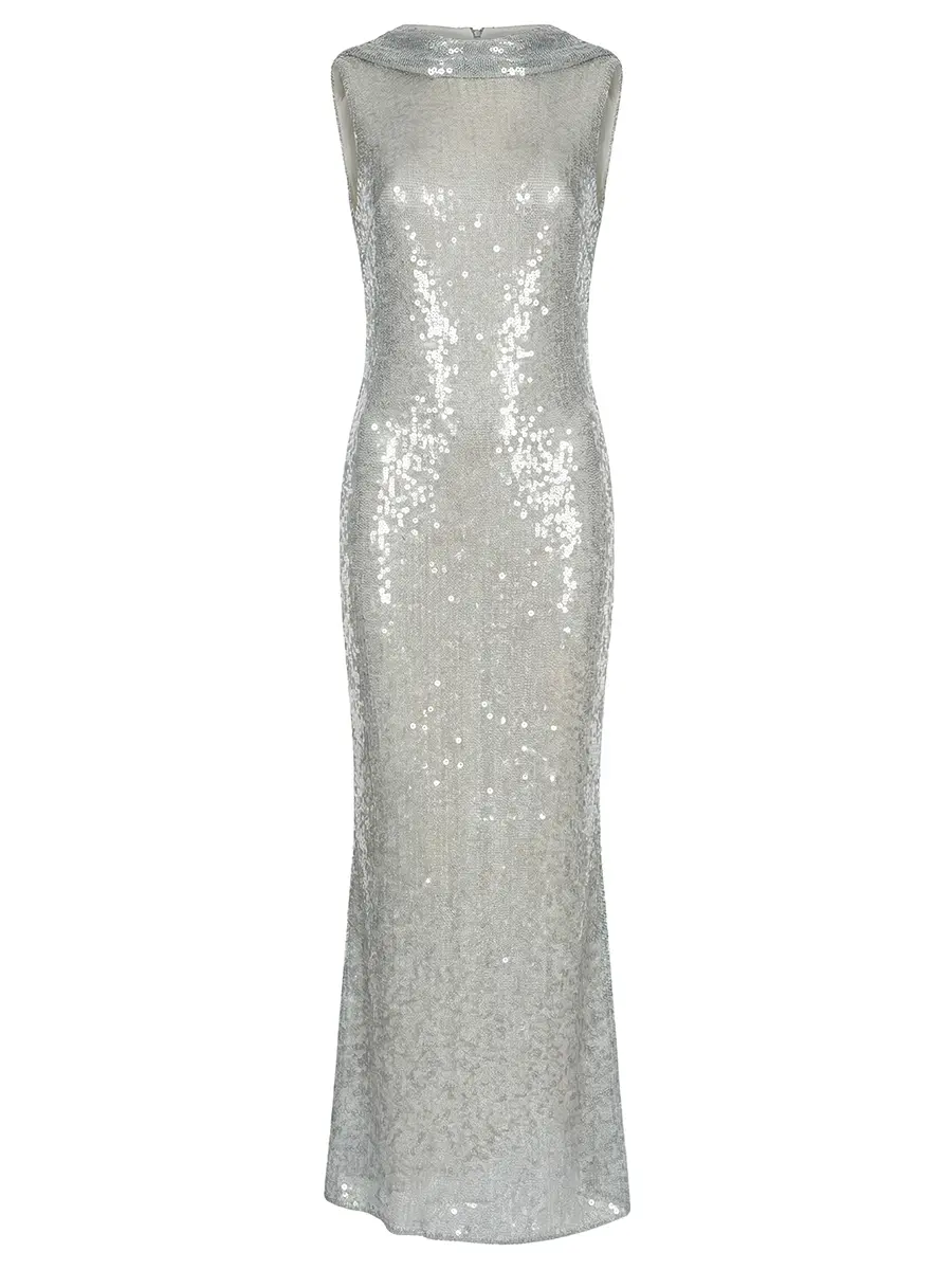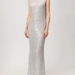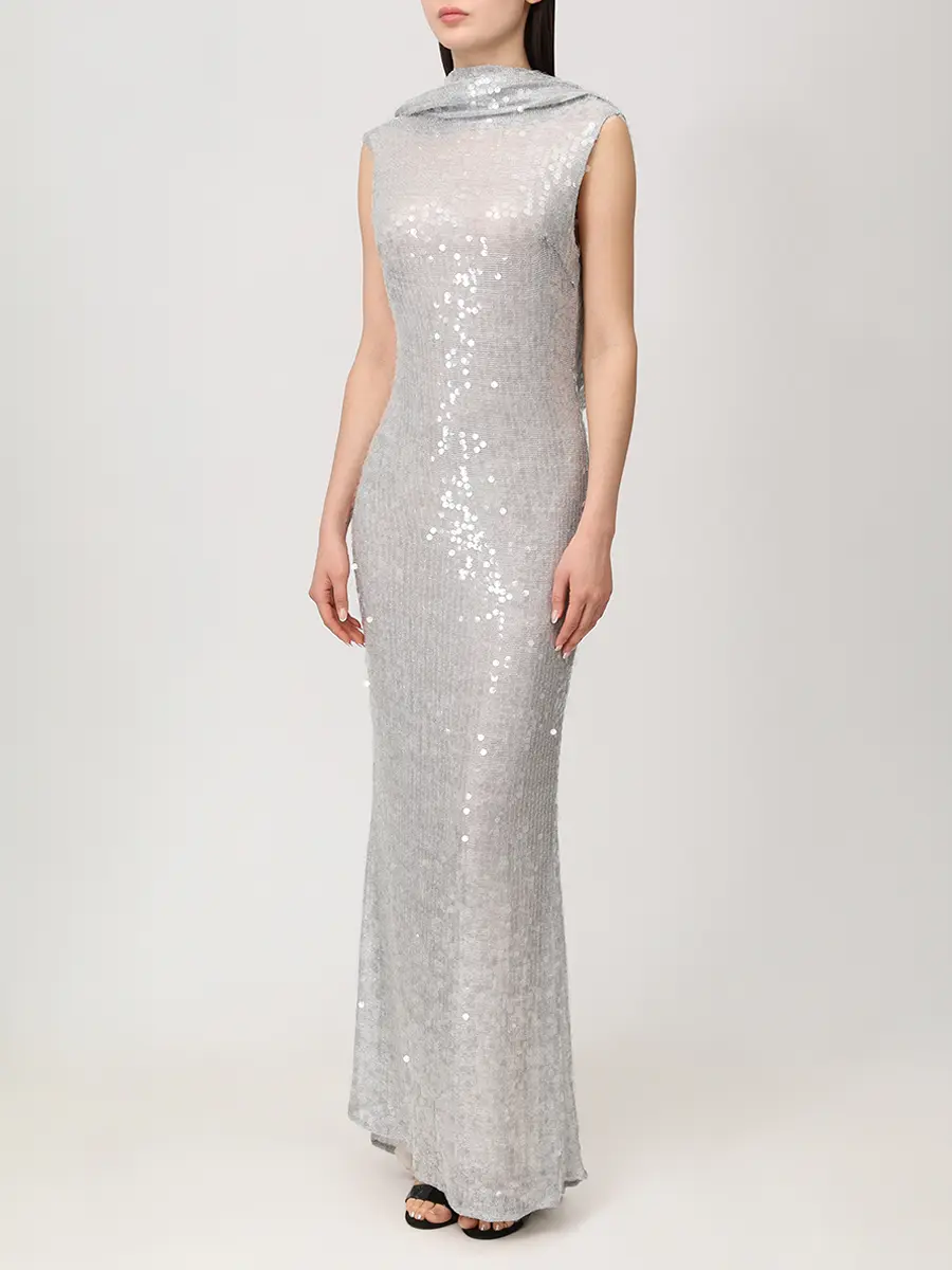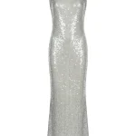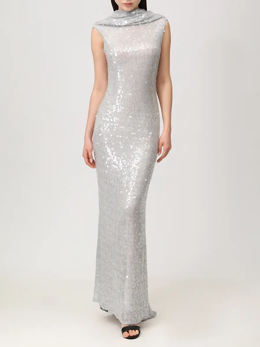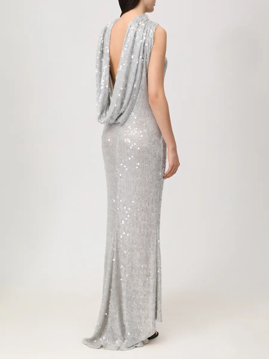 -Серебристое платье-макси, расшитое пайетками, от PHATEMM. -Модель приталенного кроя, деликатно облегающего талию и бедра, с небольшим шлейфом и эффектным глубоким вырезом с мягкой драпировкой на спине. -Лёгкое мерцание и удлинённый силуэт создают утончённый вечерний образ.