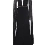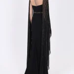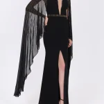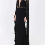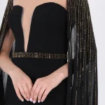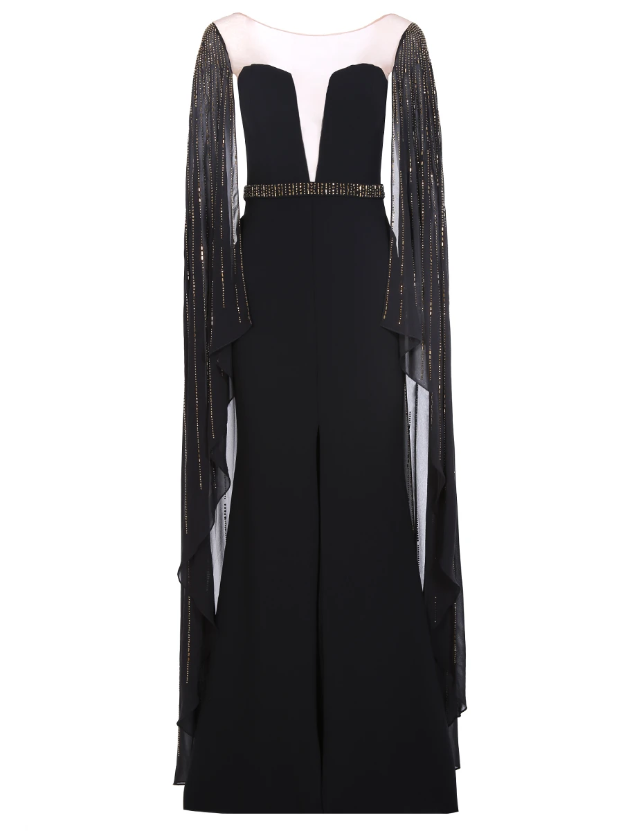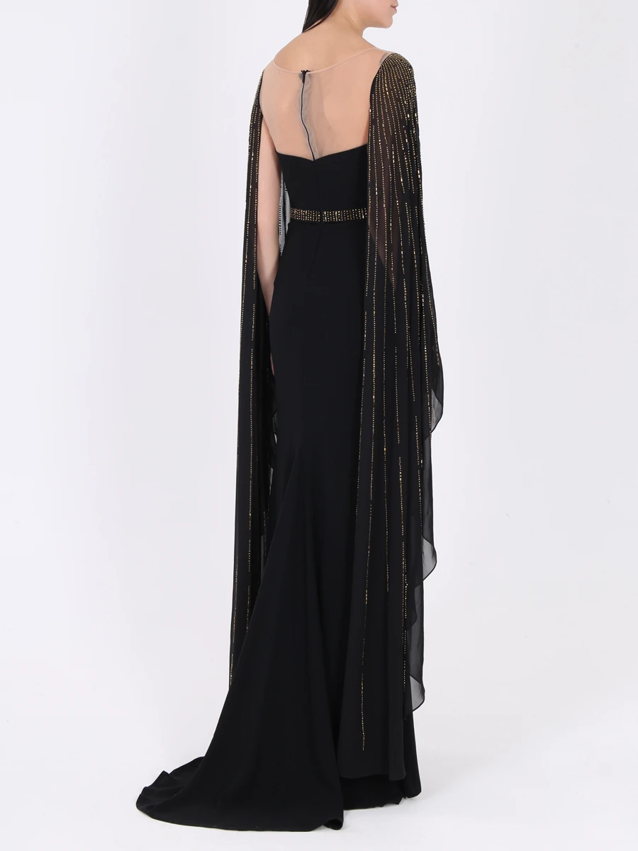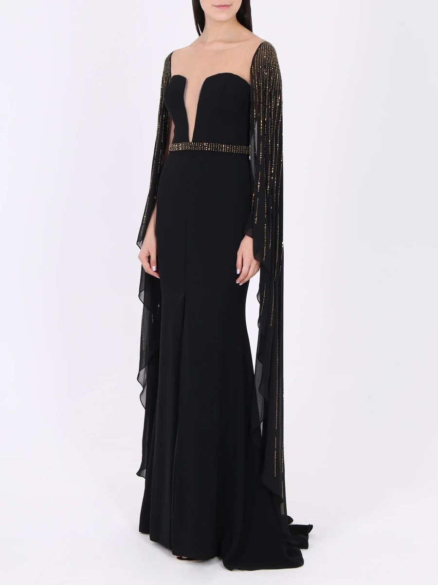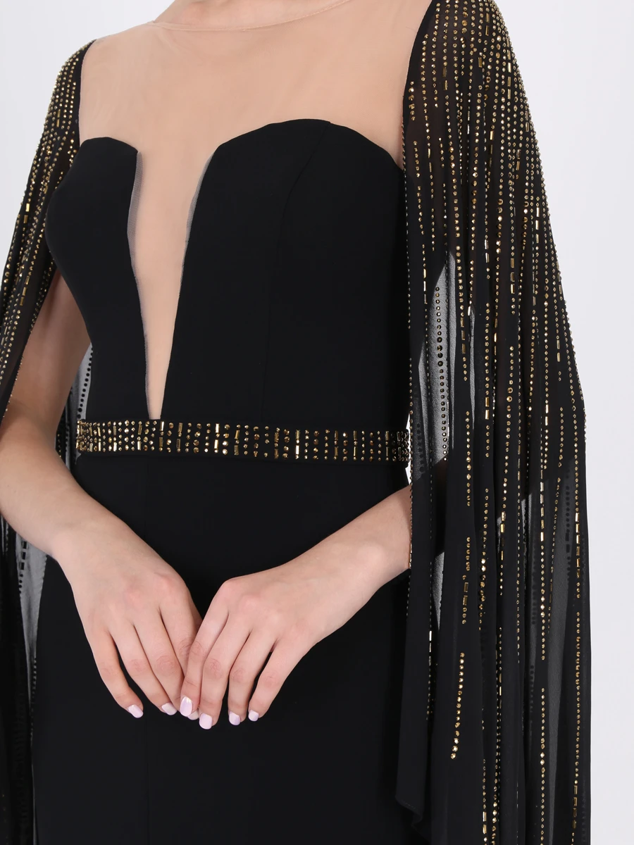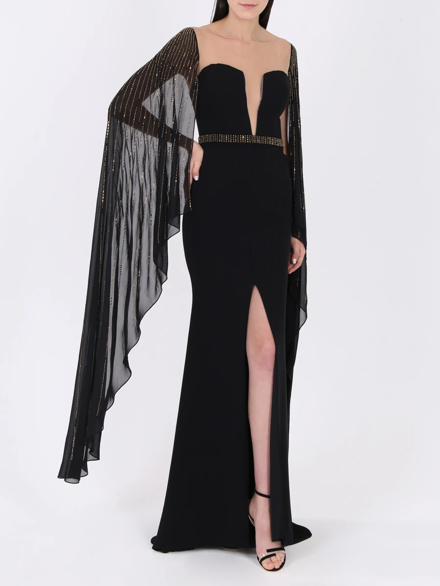 -Вечернее платье в пол длины макси со шлейфом от FOREVER UNIQUE. -Открытая приспущенная линия плеч и декольте, V-образный вырез декольте и круглый вырез горловины на прозрачной сетке, длинные ниспадающие рукава «летучая мышь». -Расшитый узкий пояс в тон рукавам, подчеркивает талию. -Приталенный силуэт, длинная струящаяся юбка, шлейф, разрез от бедра.