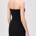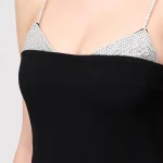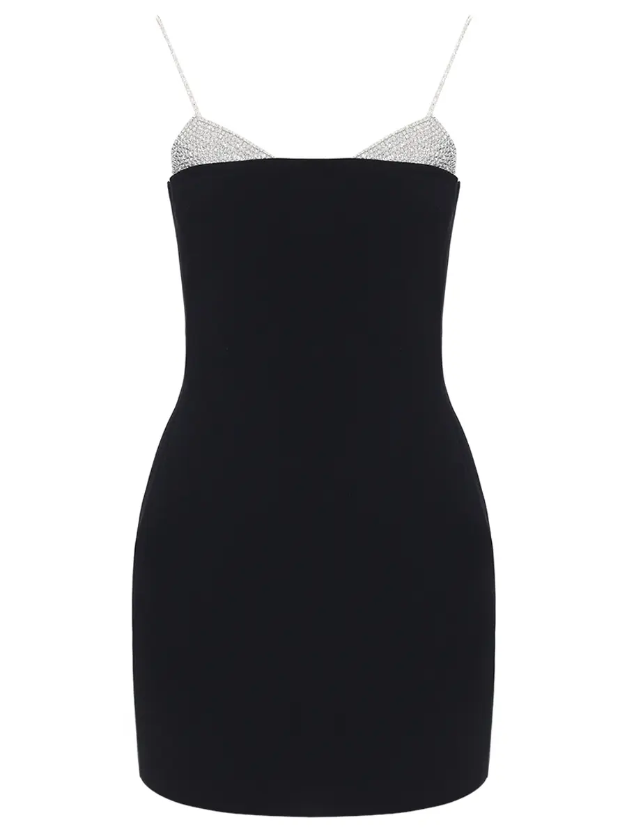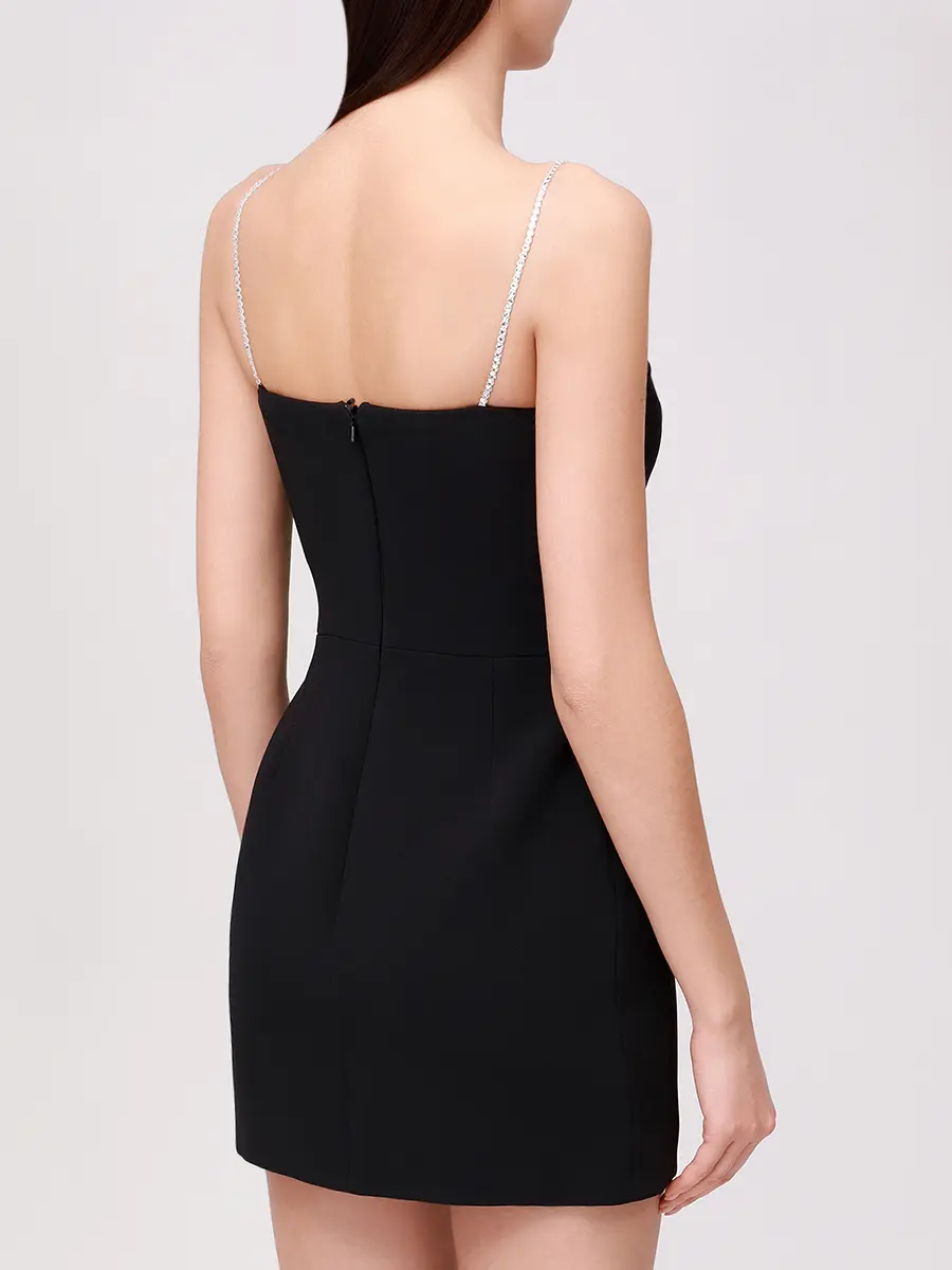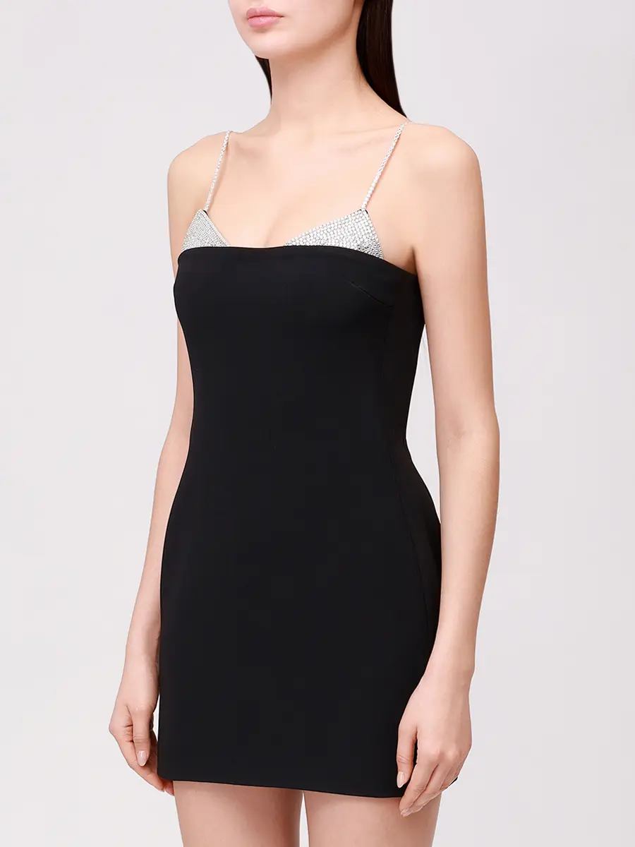-Черное мини-платье купажированного состава от DAVID KOMA. -Модель с акцентом кроя на талии и бедрах, стилизацией лифа со стразами и узкими бретелями. -Застежка на потайную молнию сзади не отвлекает от чистоты линий кроя.