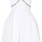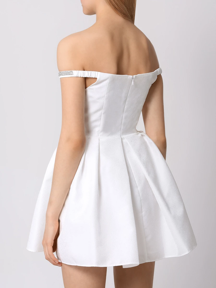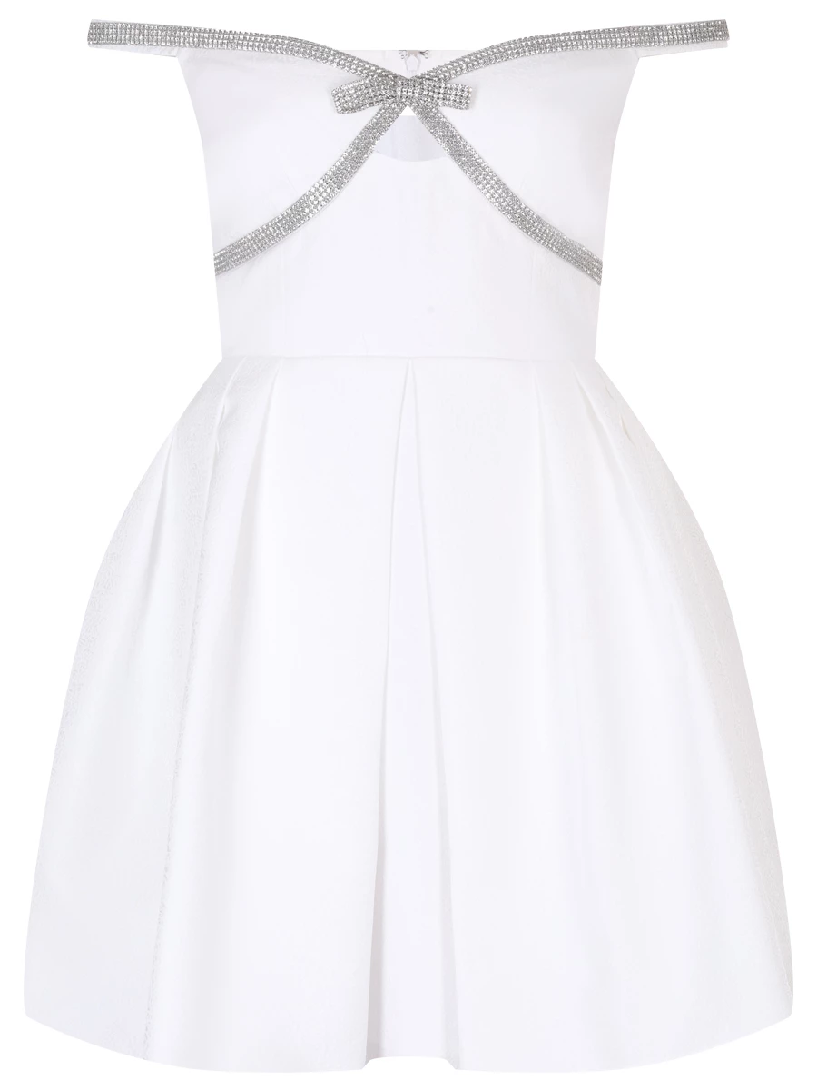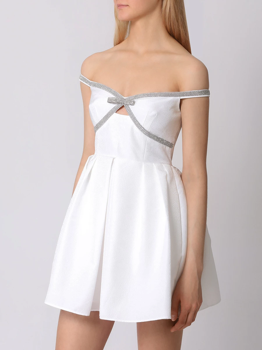 -Белое мини-платье с узором в тон от SELF-PORTRAIT. -Модель с акцентом кроя на высокой отрезной талии, пышной расклешенной юбкой, прямой открытой линией декольте, узкими бретелями, застежкой на потайную молнию сзади. -Декор стразовой лентой добавляет сдержанные блики, к которым можно подобрать туфли или украшения с той же отделкой.