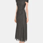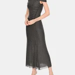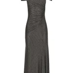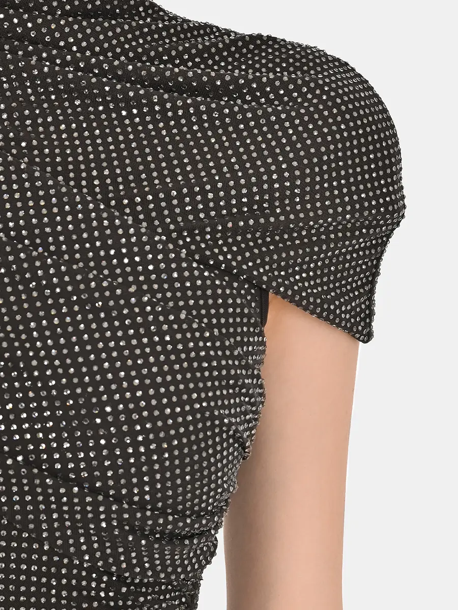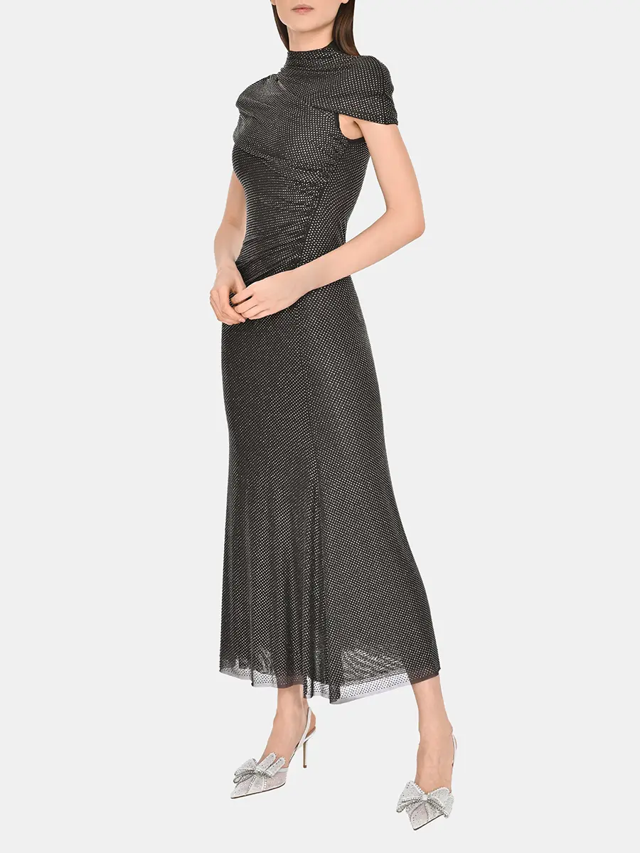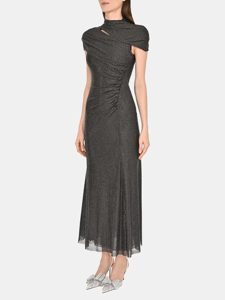 -Темно-серые платье со стразами от SELF-PORTRAIT. -Модель прилегающего силуэта с драпировкой по бокам и на лифе, асимметричным разрезом, открывающим линию декольте, застежкой на потайную молнию сзади.