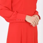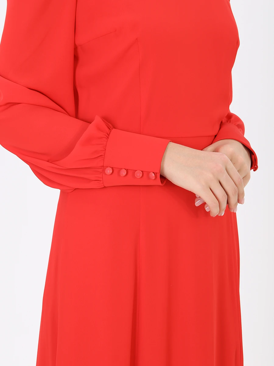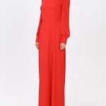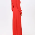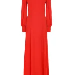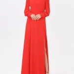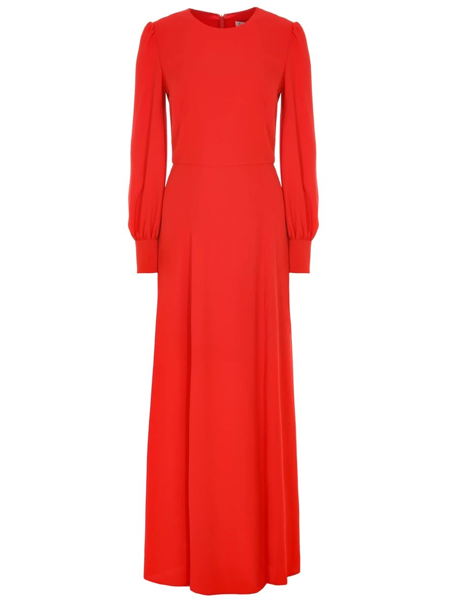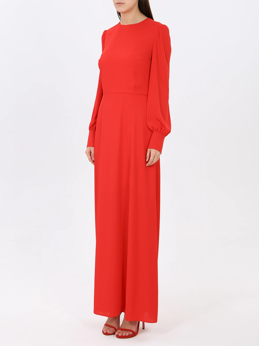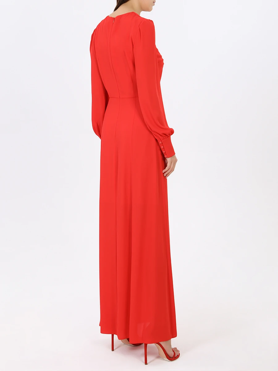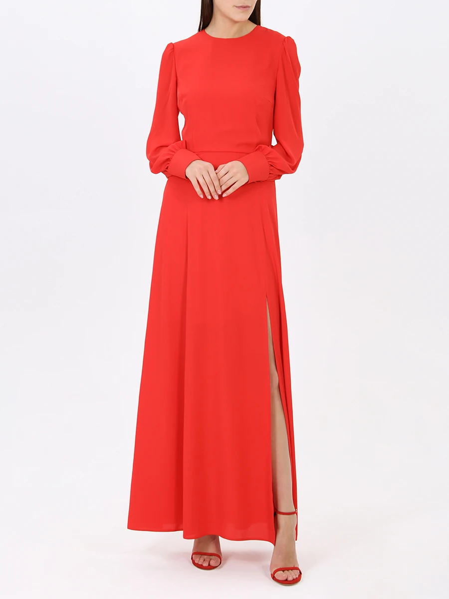 -Красное платье в пол длины макси от A LA RUSSE. -Приталенный силуэт, длинные рукава, манжеты на пуговицах, юбка с легким плиссе и глубоким вырезом, круглый вырез горловины, застежка-молния.