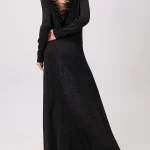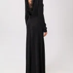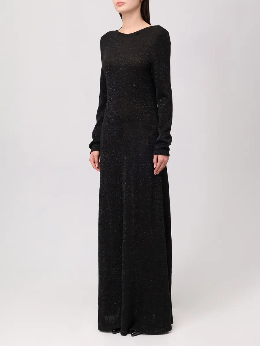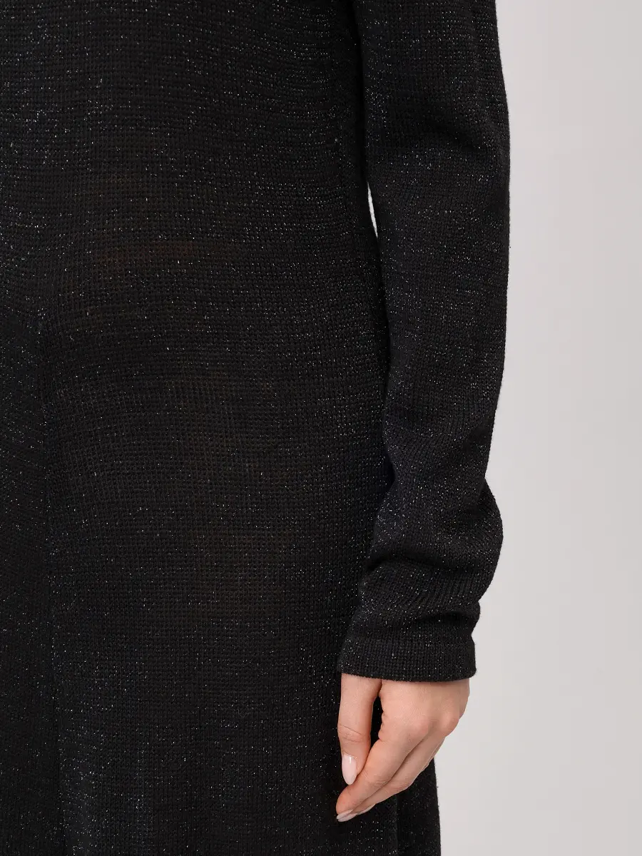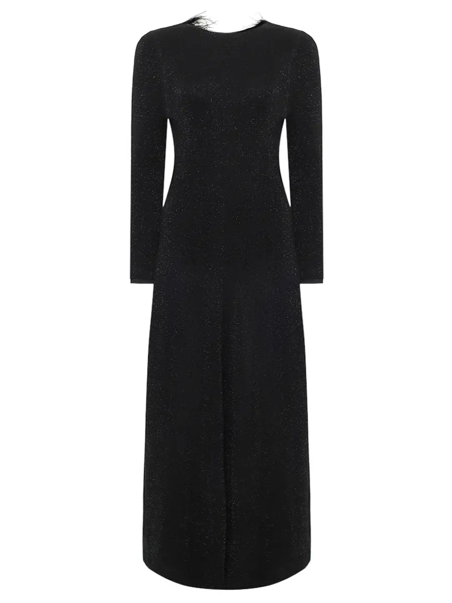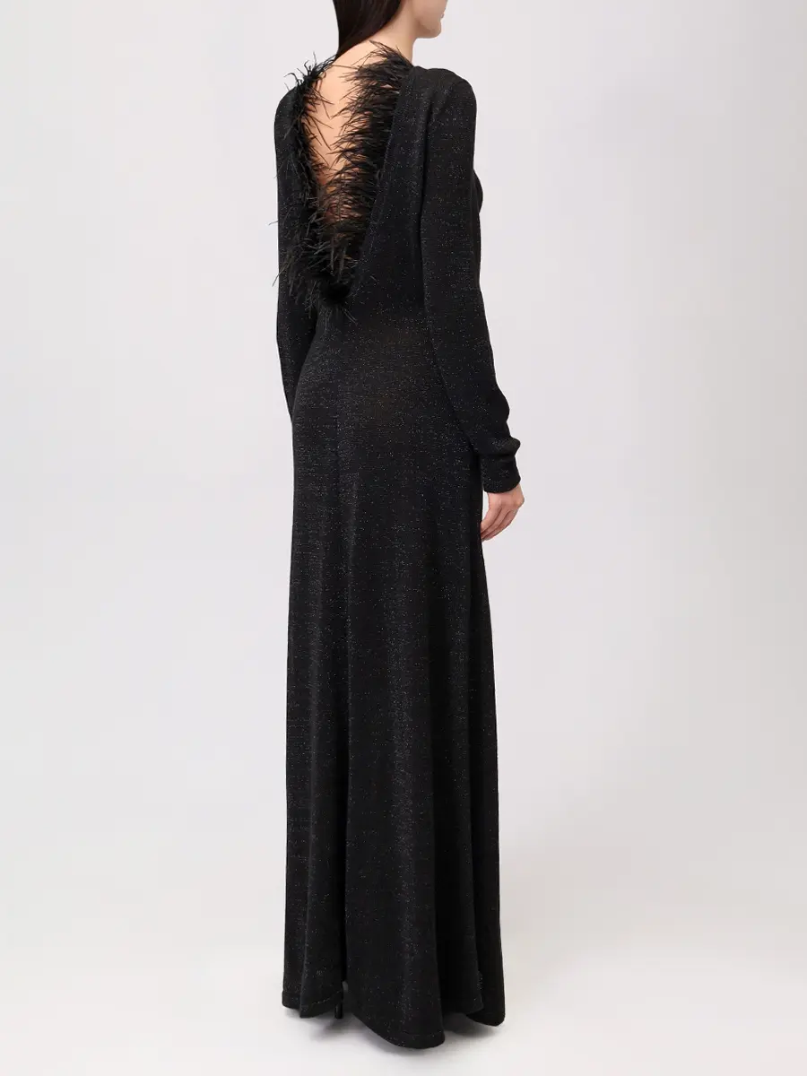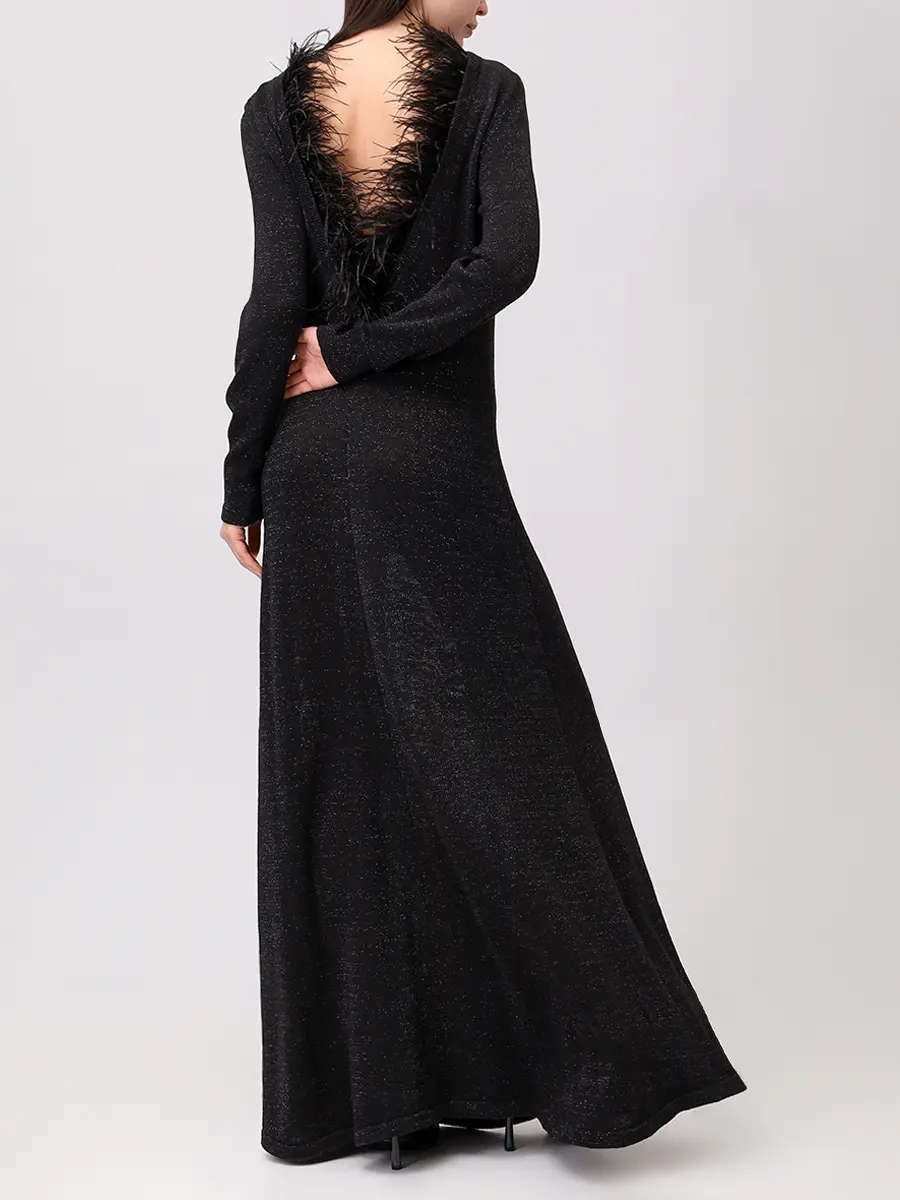 -Черное платье из натурального хлопка с добавлением люрекса от KSI KSI. -Модель с кроем по фигуре, длинными рукавами, круглым вырезом горловины, глубоким вырезом на спине с отделкой съемными перьями. -Лаконичное платье, в котором нет ничего лишнего уместно дополнит коктейльные или вечерние мероприятия. -Изделие подойдет на размер 42/44.