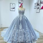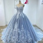 Пыльно-Синее Кружевное Бальное Платье Пышное Платье Quinceanera