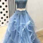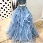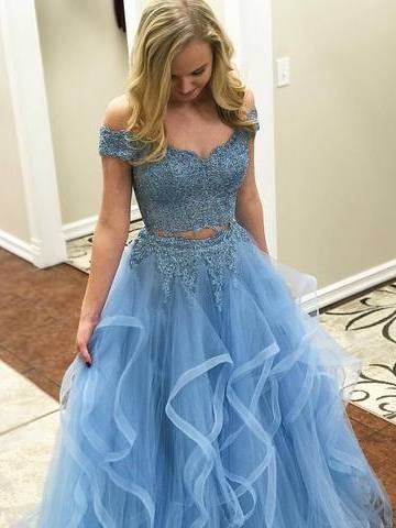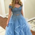 Пыльно-Синее Платье Для Выпускного Вечера С Юбкой Из Двух Частей С Открытыми Плечами И Оборками