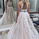 Красивое платье для выпускного вечера из кружева и тюля с бретелькой на шее.