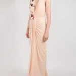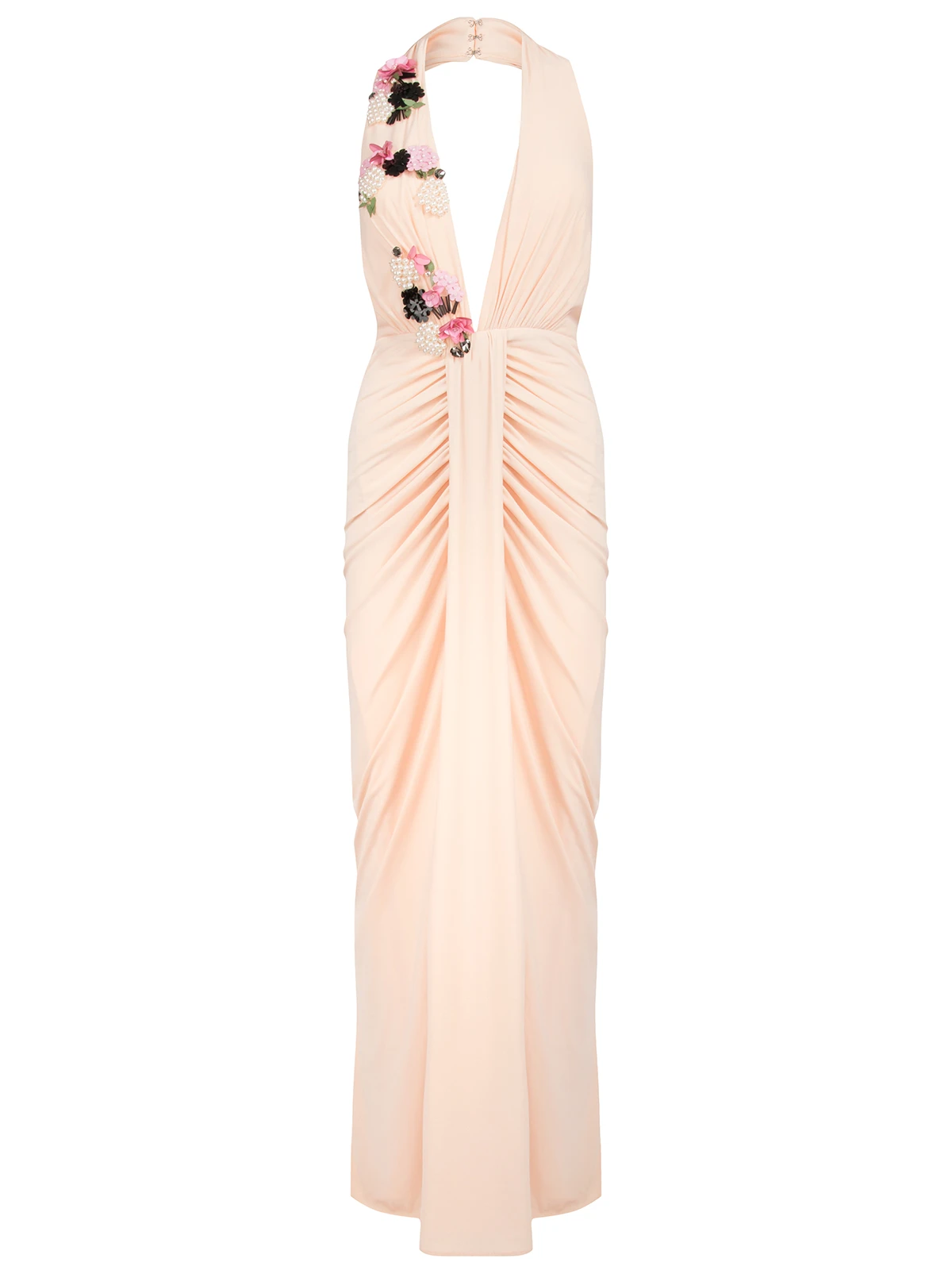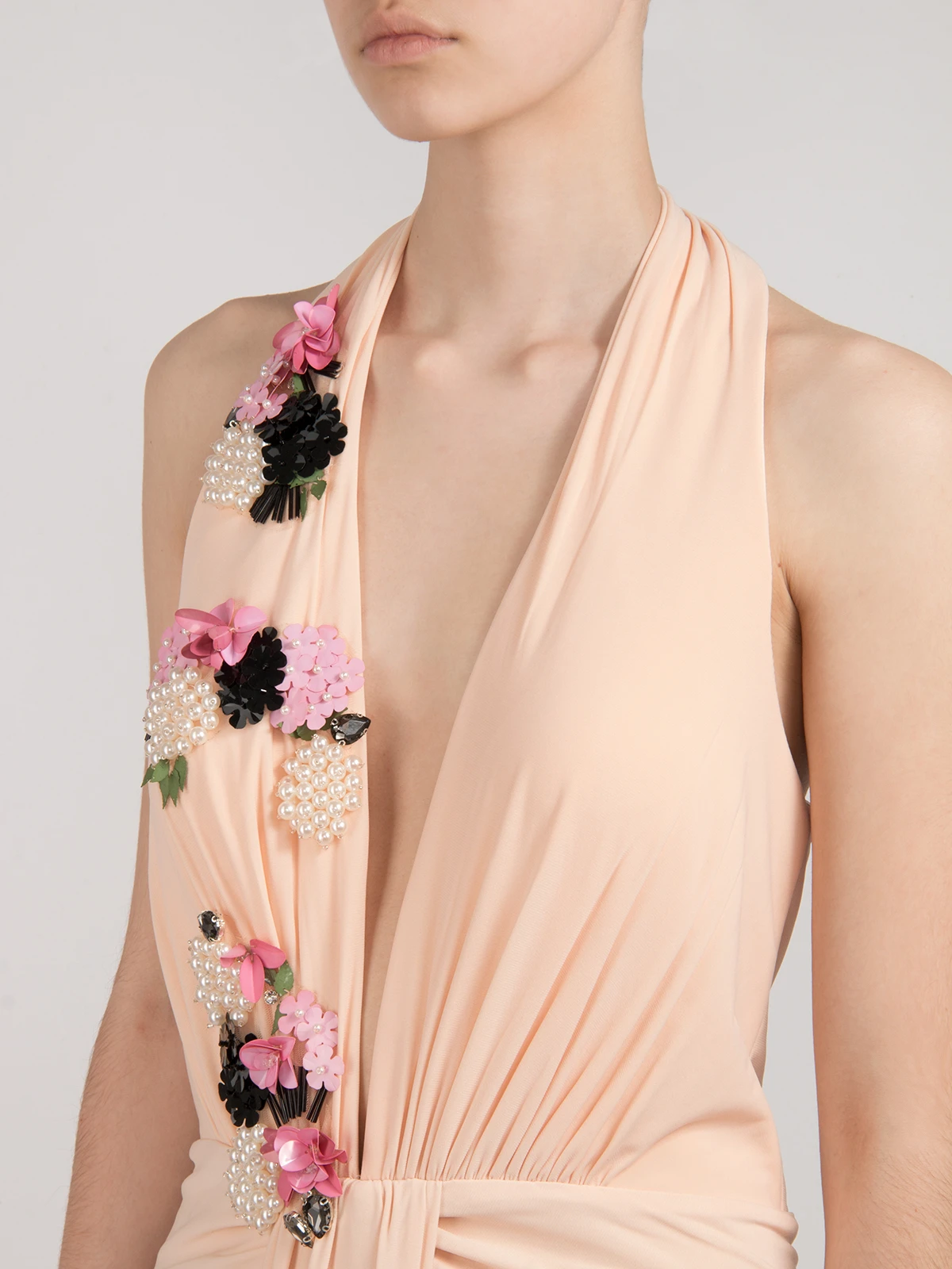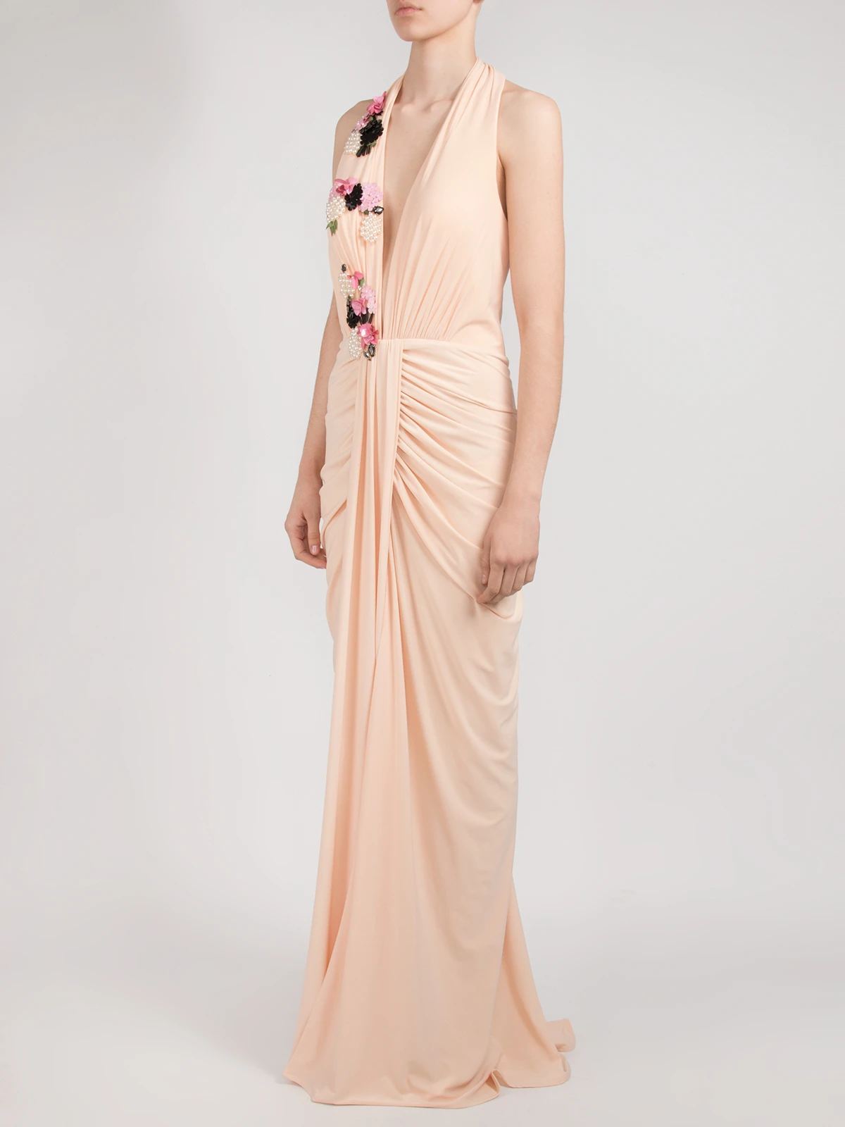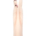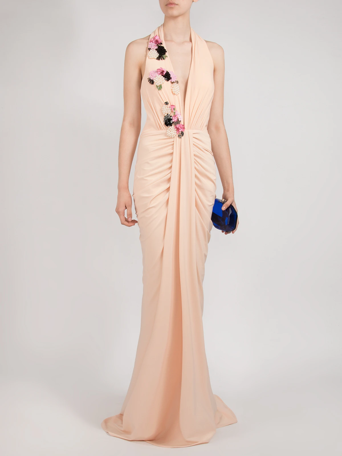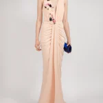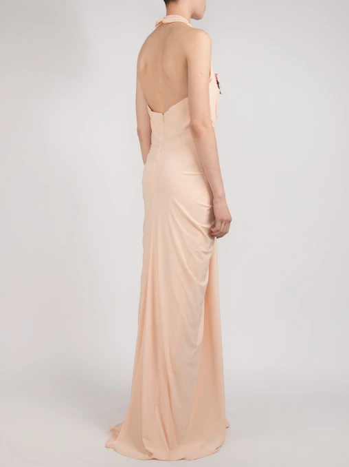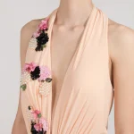 -Вечернее платье от Forever Unique. -Модель выполнена в бежевом цвете с декорированными паейтками аппликациями. -V-вырез на груди, сборка на талии, застежка — молния.
