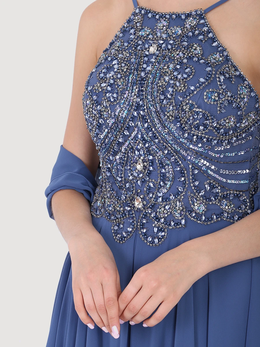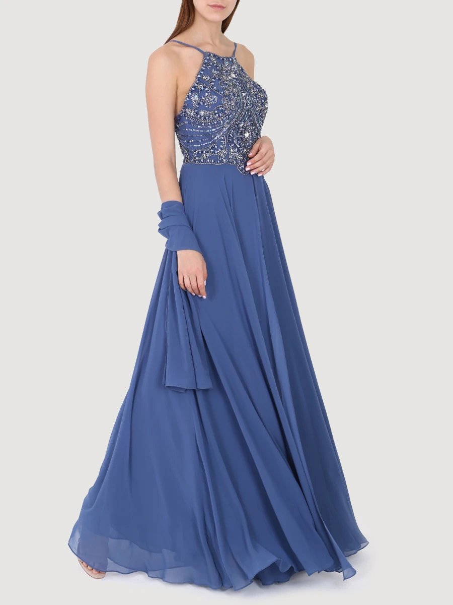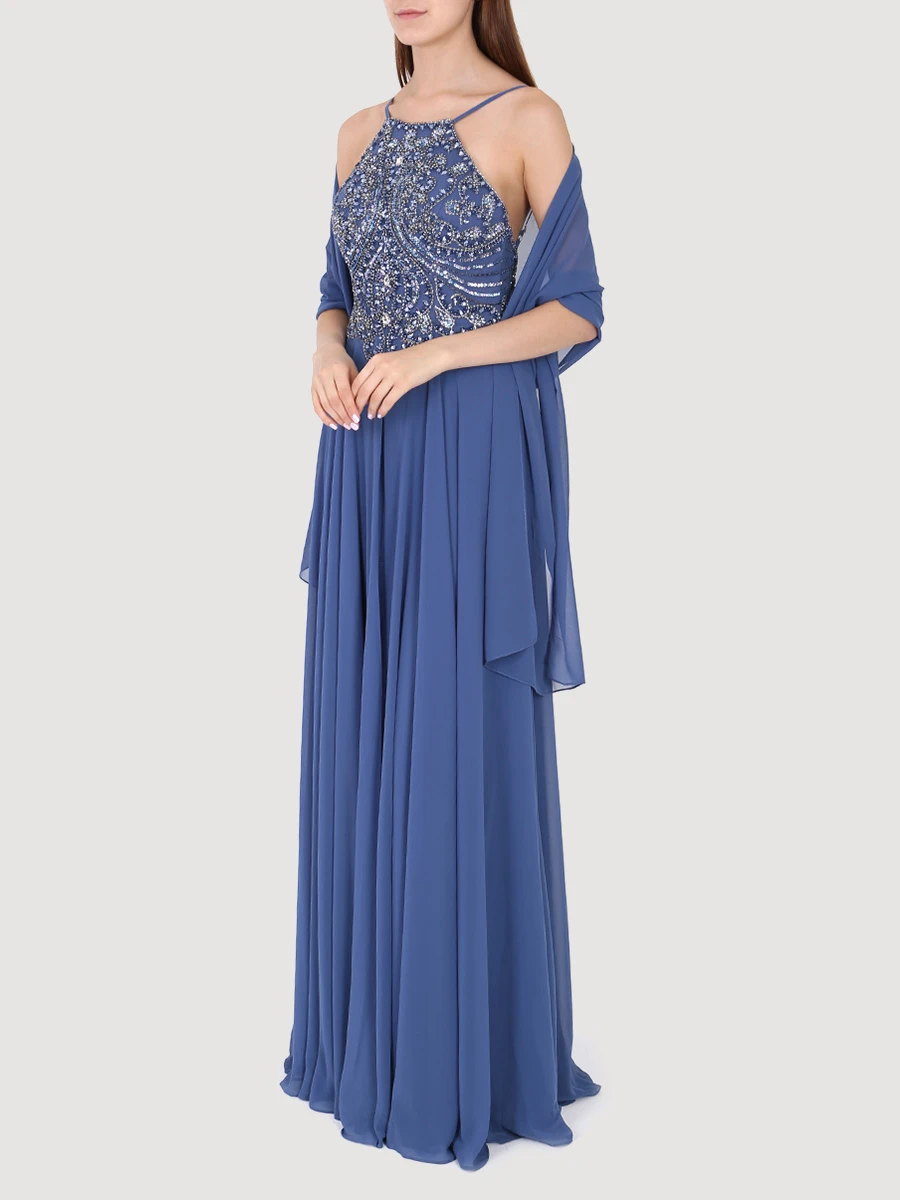 -Эффектное вечернее платье в пол «Jakku» от Forever Unique. -Лиф изделия с роскошной отделкой кристаллами, стеклярусом и пайетками. -Воротник халтер, открытая спинка, струящийся подол, легкая накидка в тон, потайная застежка на молнию сзади.