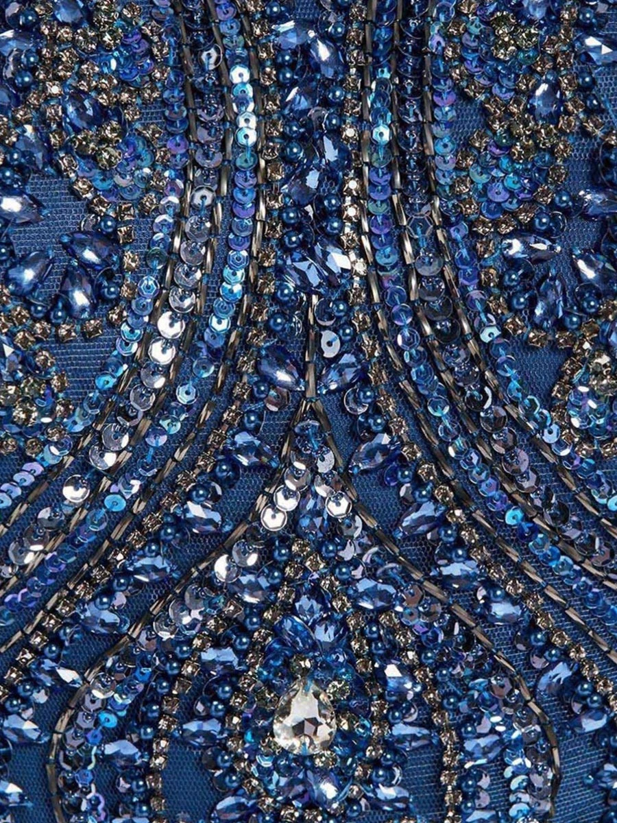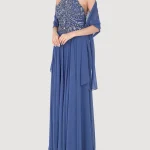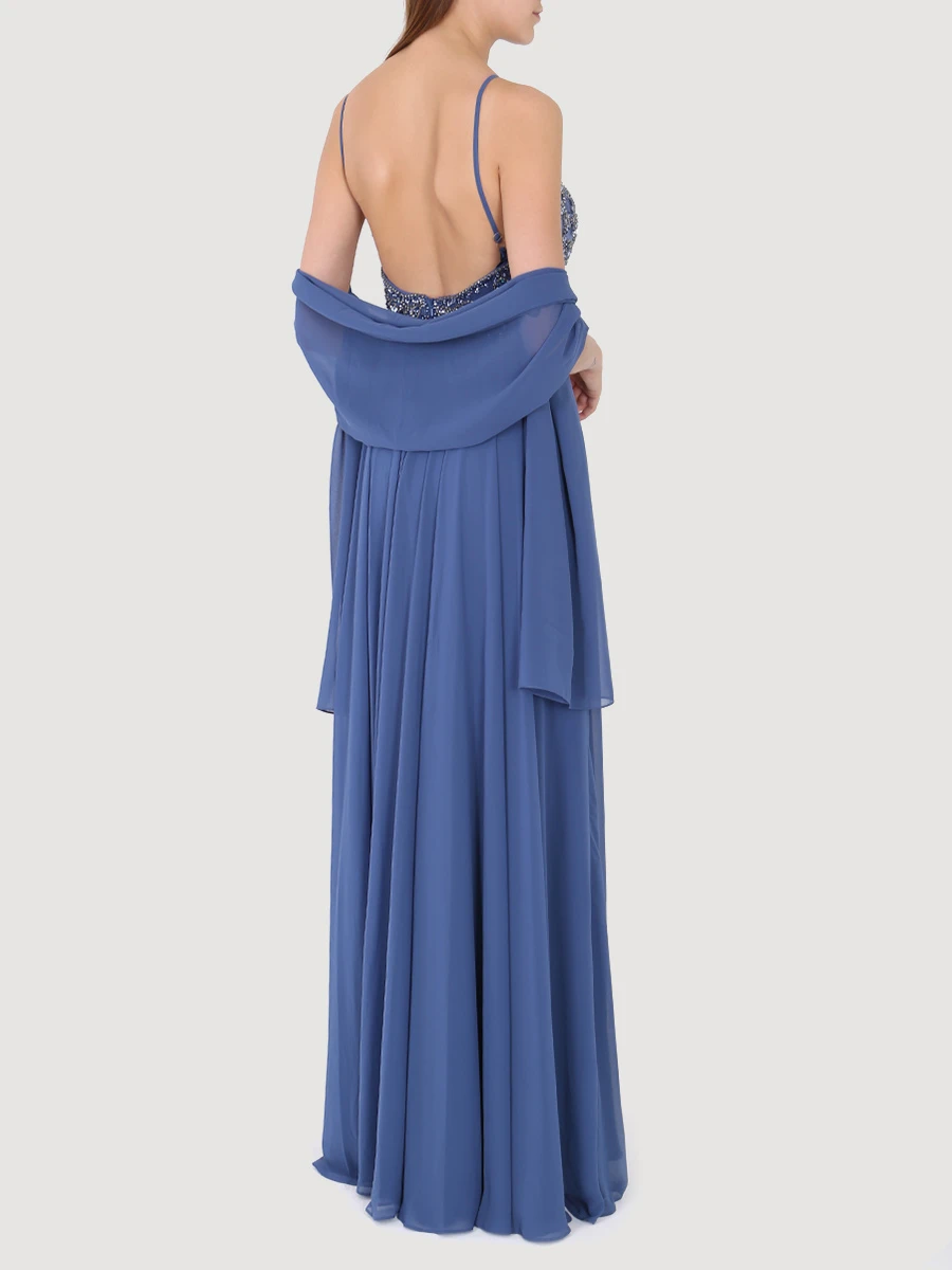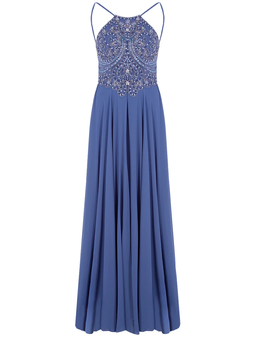 -Эффектное вечернее платье в пол «Jakku» от Forever Unique. -Лиф изделия с роскошной отделкой кристаллами, стеклярусом и пайетками. -Воротник халтер, открытая спинка, струящийся подол, легкая накидка в тон, потайная застежка на молнию сзади.