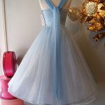 Голубое короткое платье для выпускного из тюля и воротником-хомутом Fairy