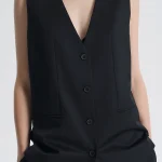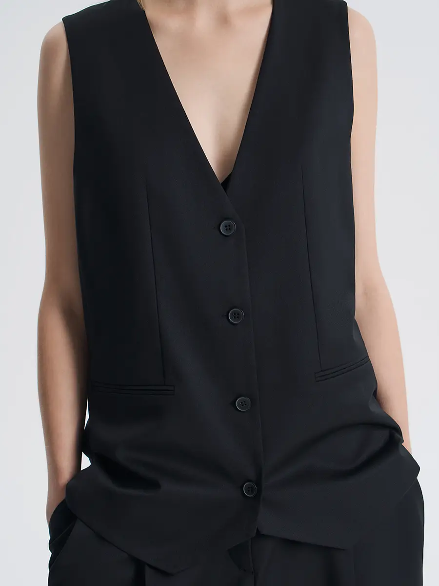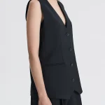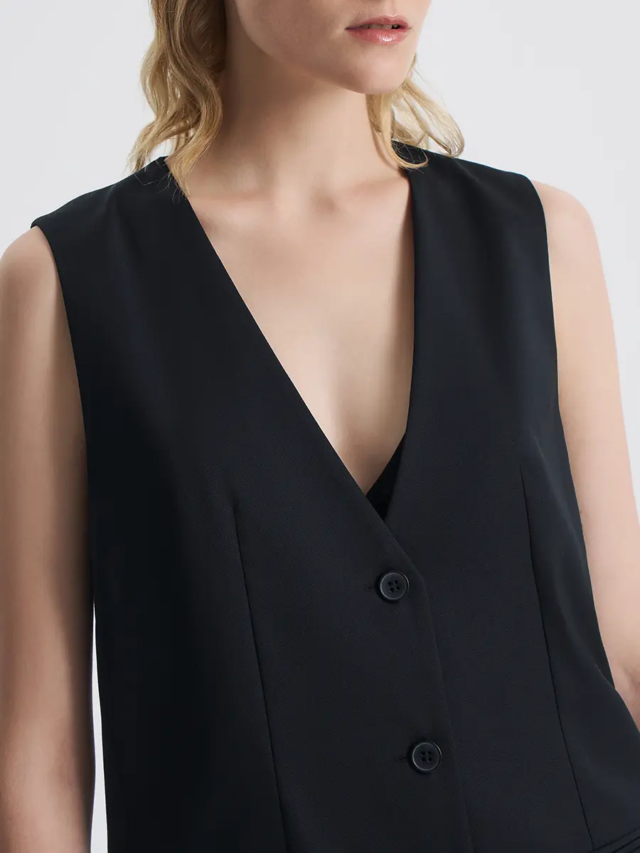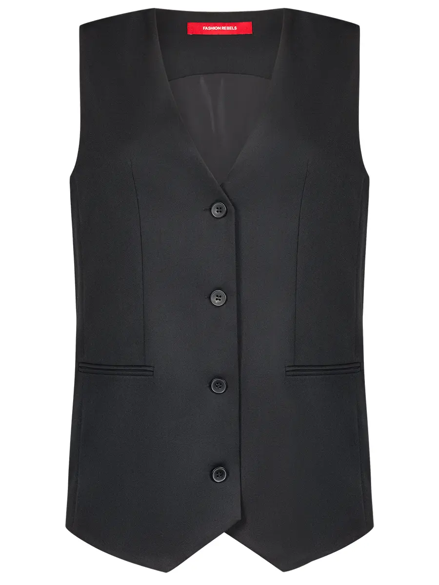-Жилет из смесовой шерсти в черном цвете от FASHION REBELS. -Жилет оверсайз из смесовой шерсти не случайно представлен в рамках новогодней капсулы 2026 г.: стилизуйте его как топ в комплекте с брюками из такого же материала для строгих и элегантных вечерних образов. -За рамками светских выходов жилет отлично впишется в деловой и повседневный гардероб в сочетании с блузками и водолазками. -Жилет классического кроя с формообразующими вытачками сделан в подчеркнуто расслабленном варианте оверсайз. -Изделие на шелковистой подкладке.